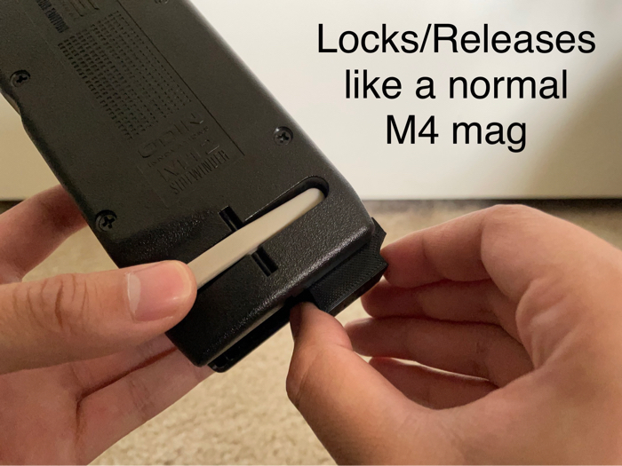 The way it works is by clicking and locking securely into the speed loader like a normal M4 magazine would. Then you can just insert your MP5 magazine and start loading. The magazine is held in by tension thanks to the size of the spacer. The tension is enough to prevent fall out from shaking, but also to allow for a quick pull to release. You can even store the spacer with your sidewinder as there is a space to fold in the handle as well