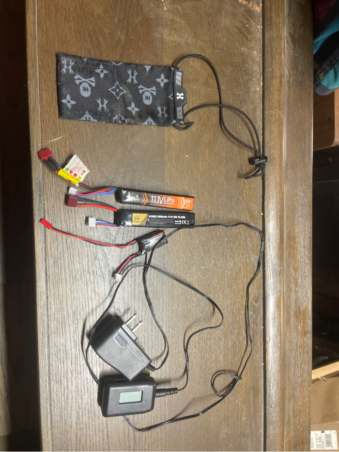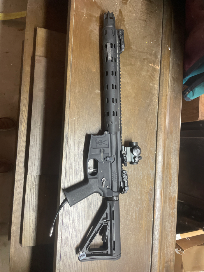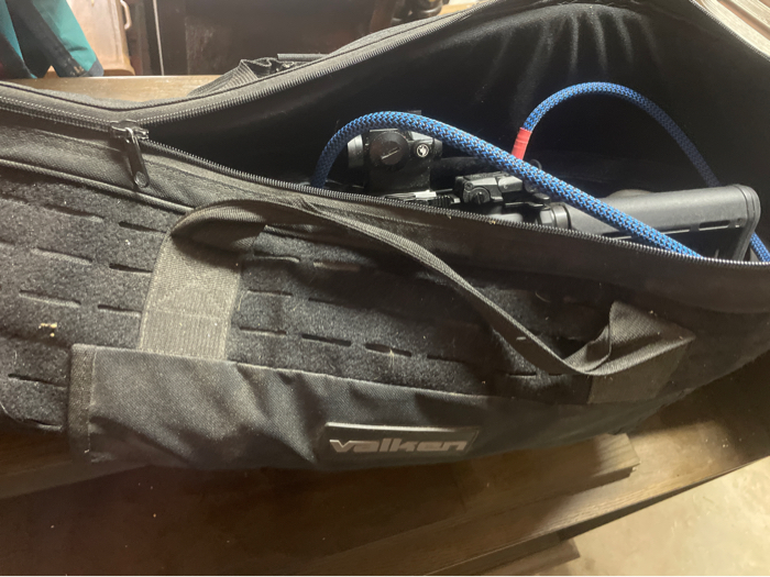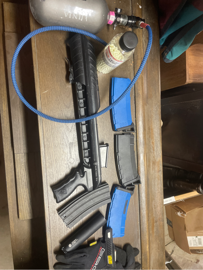 Daniel defense hpa airsoft rifle with scope and two tracers, four mags, three batteries, tank and hose, carry bag