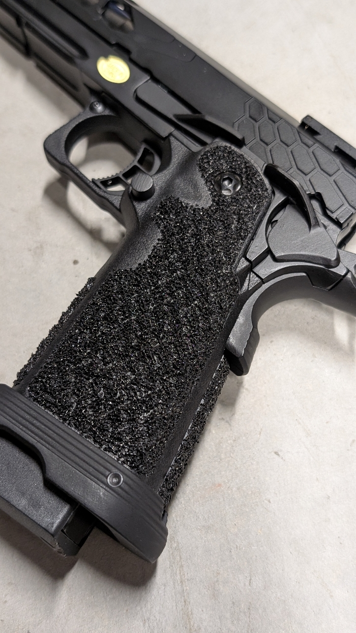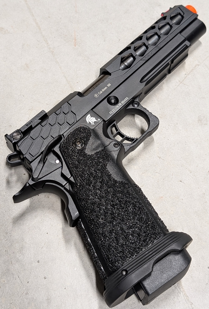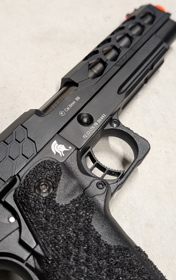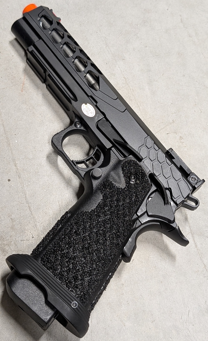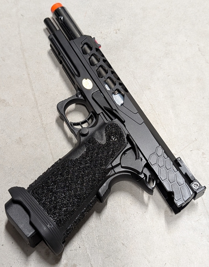 A super lightweight ported/serrated CNC aluminum slide paired with a high durability injection polymer lower makes for an incredibly durable yet light weight build ready for high speed maneuvering in the field! Insanely stippled grip ensures absolutely no slip in both hands or gloves! Hexagon cutouts give both added style and function to the slide, integrated RIS underrail for lights/lasers, fiber optic combat sights for fast targeting even in low light, responsive skeletonized comp trigger, flared magwell for fast reloads, and ambidextrous controls. The list goes on!