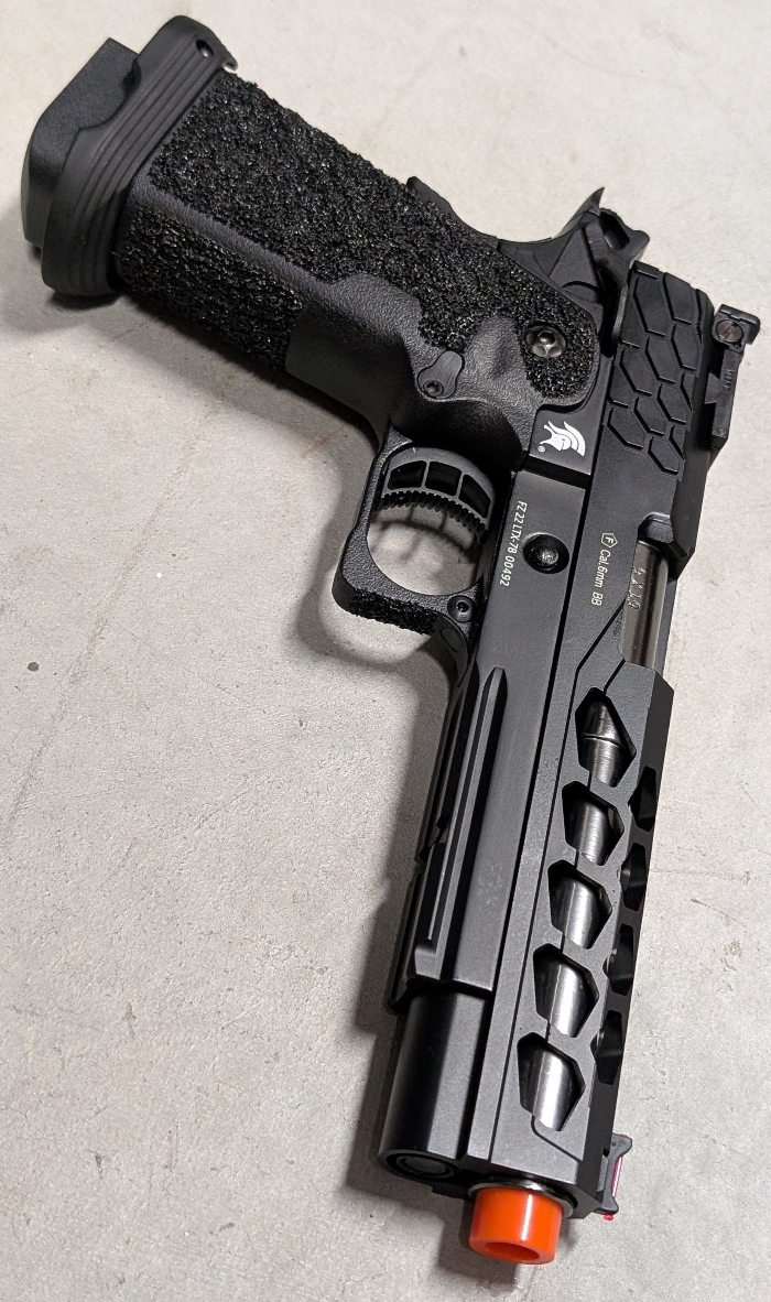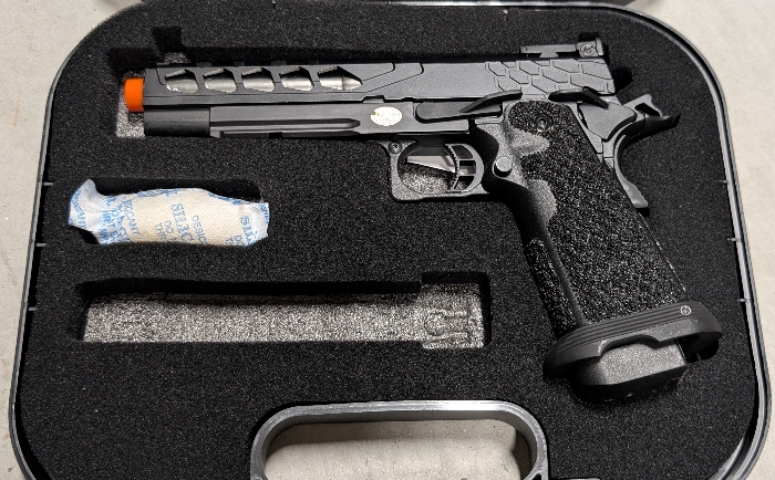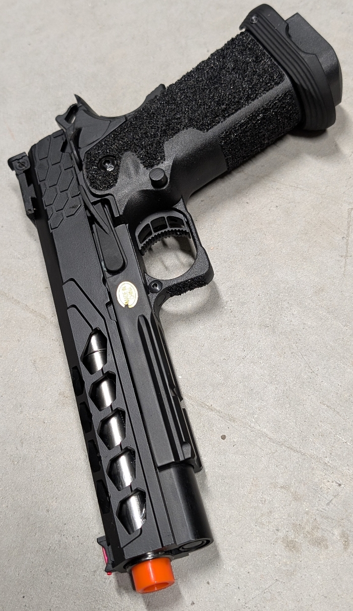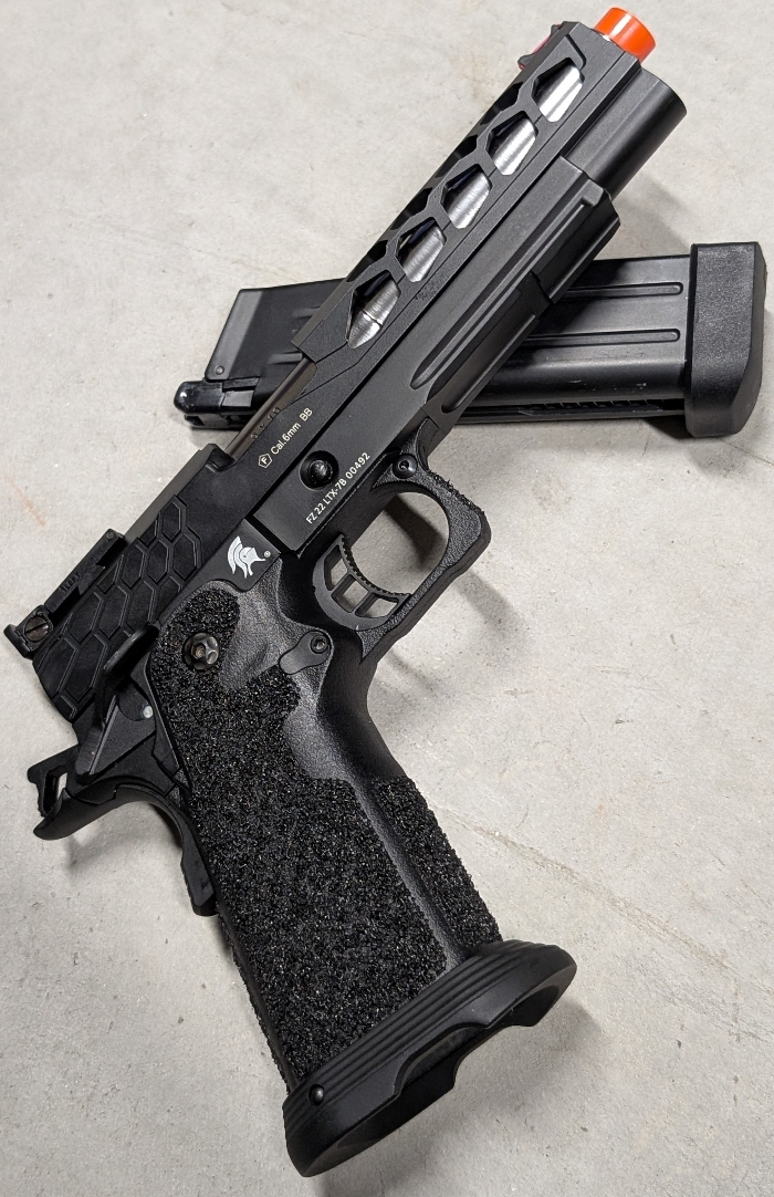 Selling a BNIB condition LT Stryk 5.1 Hi-Capa Gas Blowback pistol in a sleek Two-Tone Black/Silver colorway! Fully TM Spec, allowing for use of TM upgrade parts & Magazines, and that's just the start of all the features in this high end pistol!
