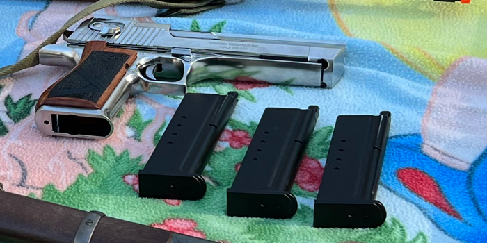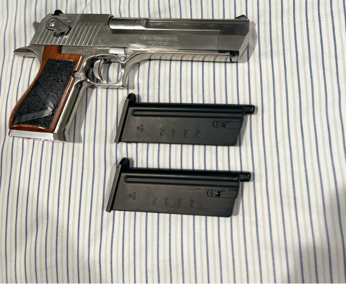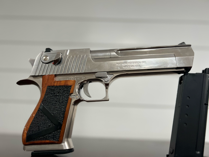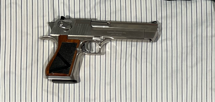 WE-Tech Chrome Desert Eagle. Comes with 3 green gas pistol magazines. Custom Indonesia imported Woodgrips from KIMPOIshop. And EMG .093 Kydex Holster with Belt Clip Mount. Original grip included.