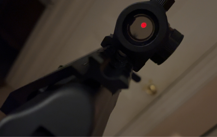 Comes with red dot, foregrip, barrel clamped laser, and rubber buttpad