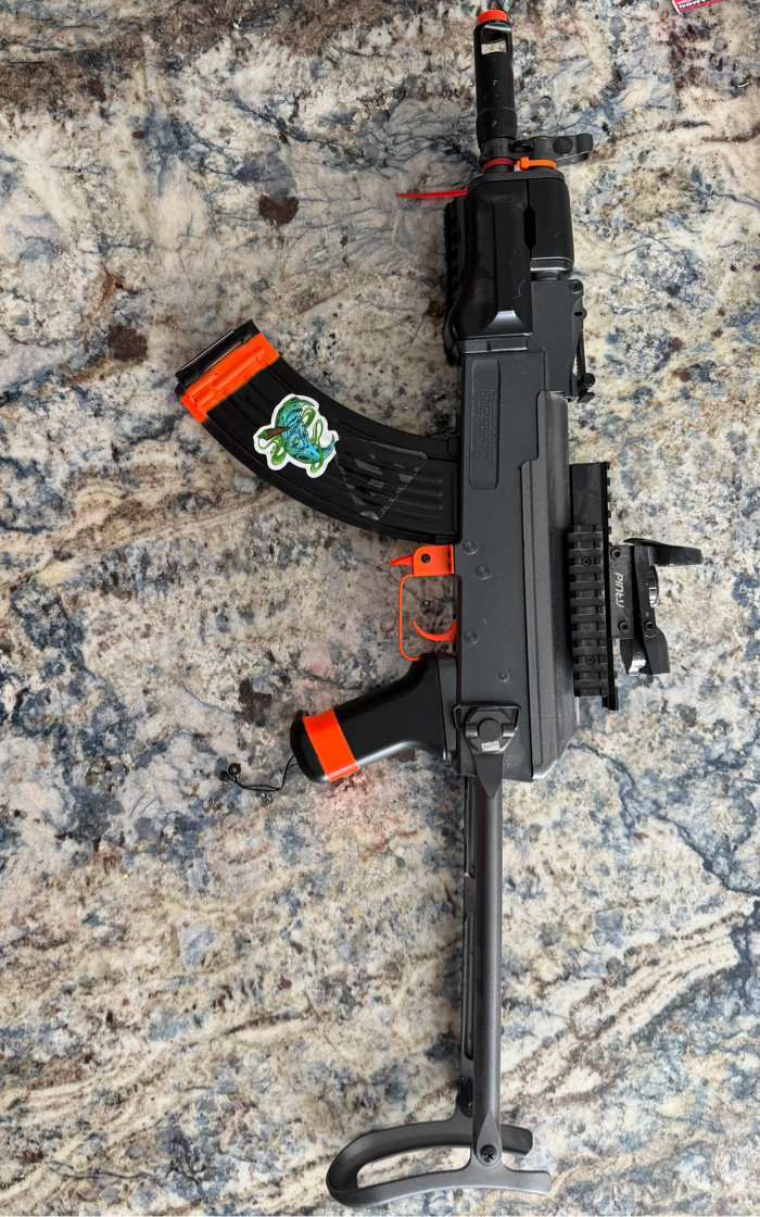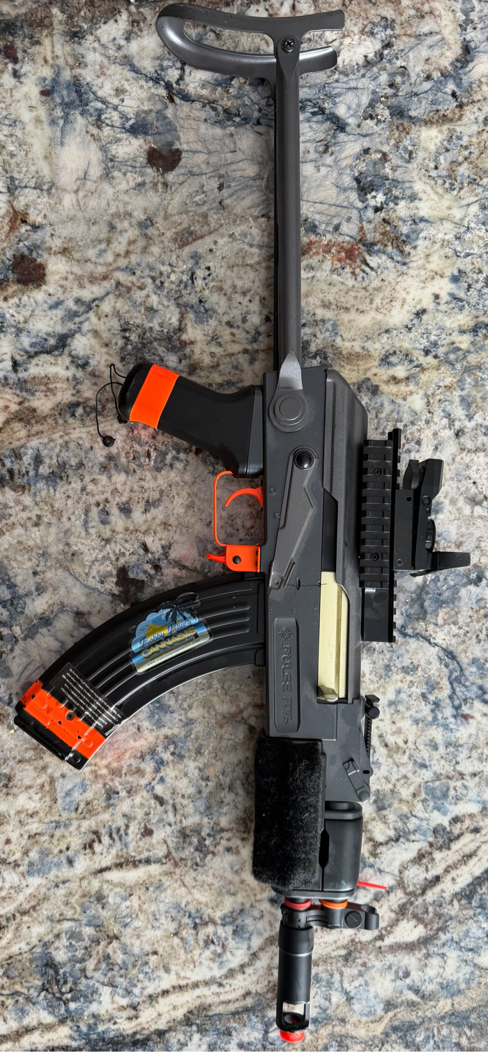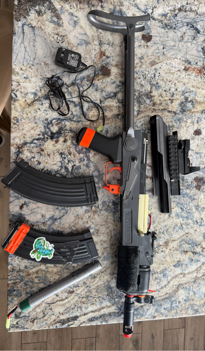 Airsoft AK-style electric rifle in good working condition. Features a top rail with red dot optic, folding stock, and durable polymer body. Includes two high-capacity magazines, rechargeable battery, and charger. Shoots in semi and full-auto. Great starter rifle or backup AEG.