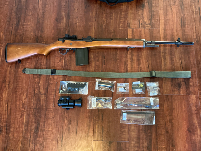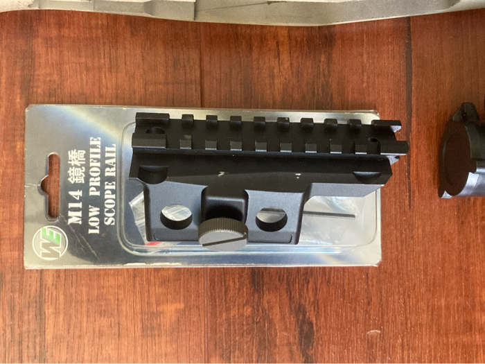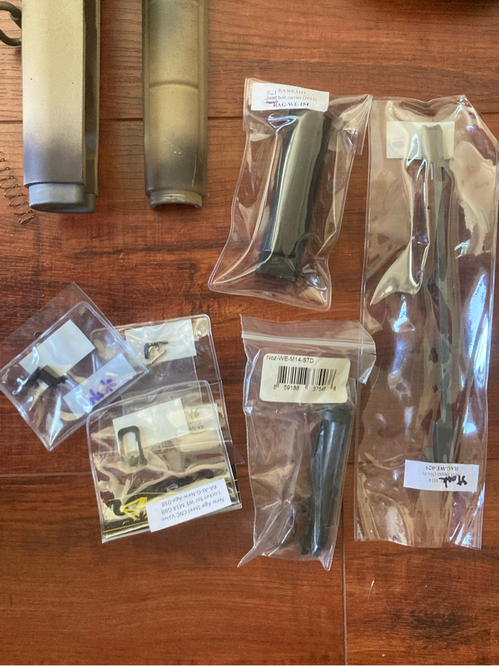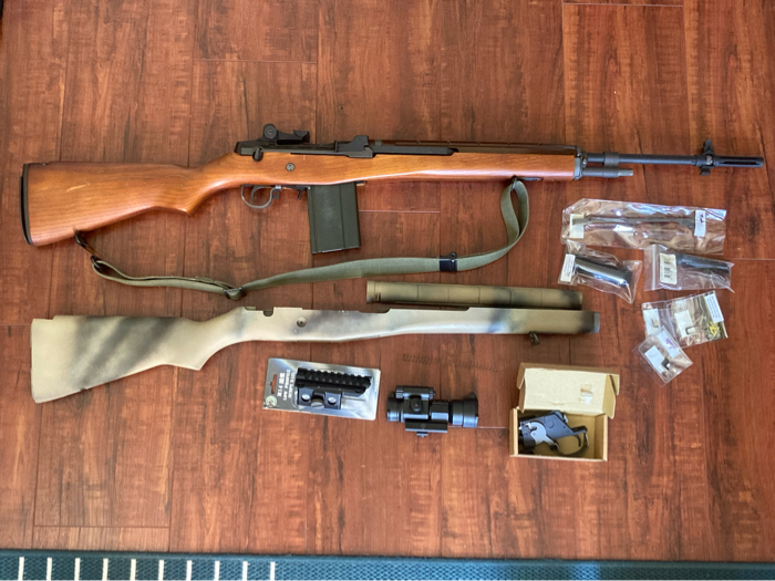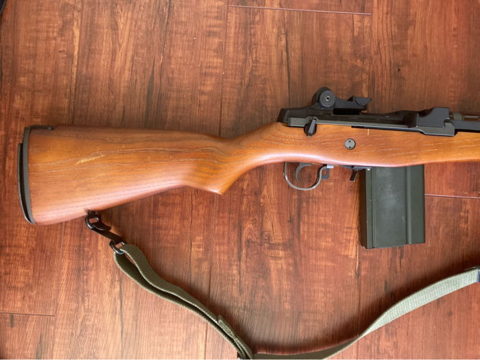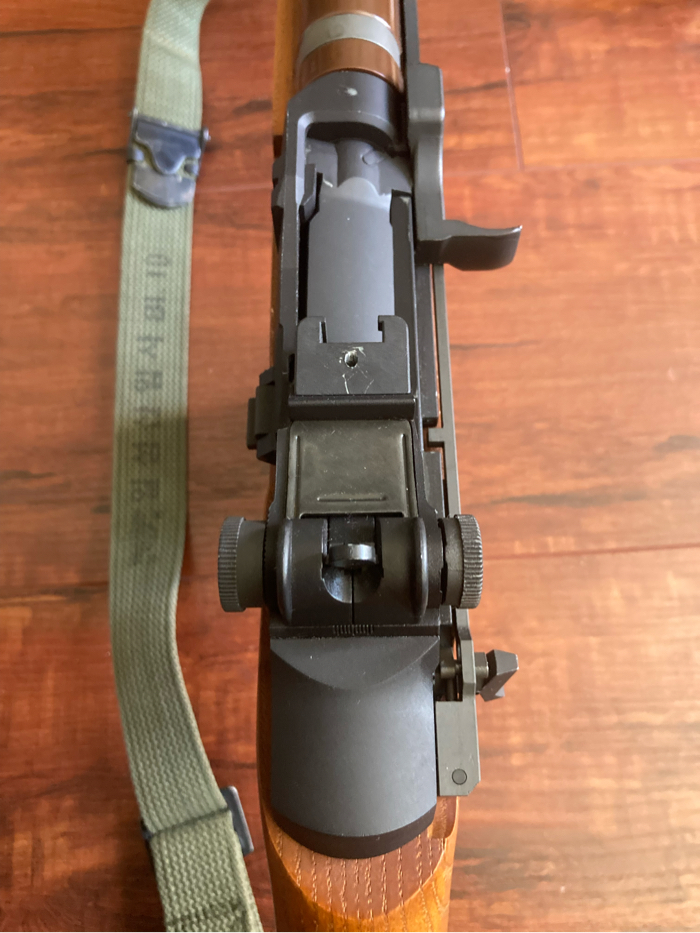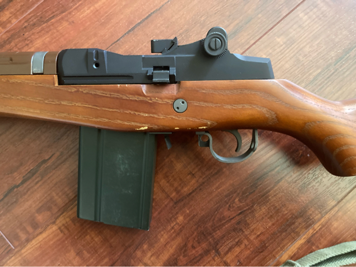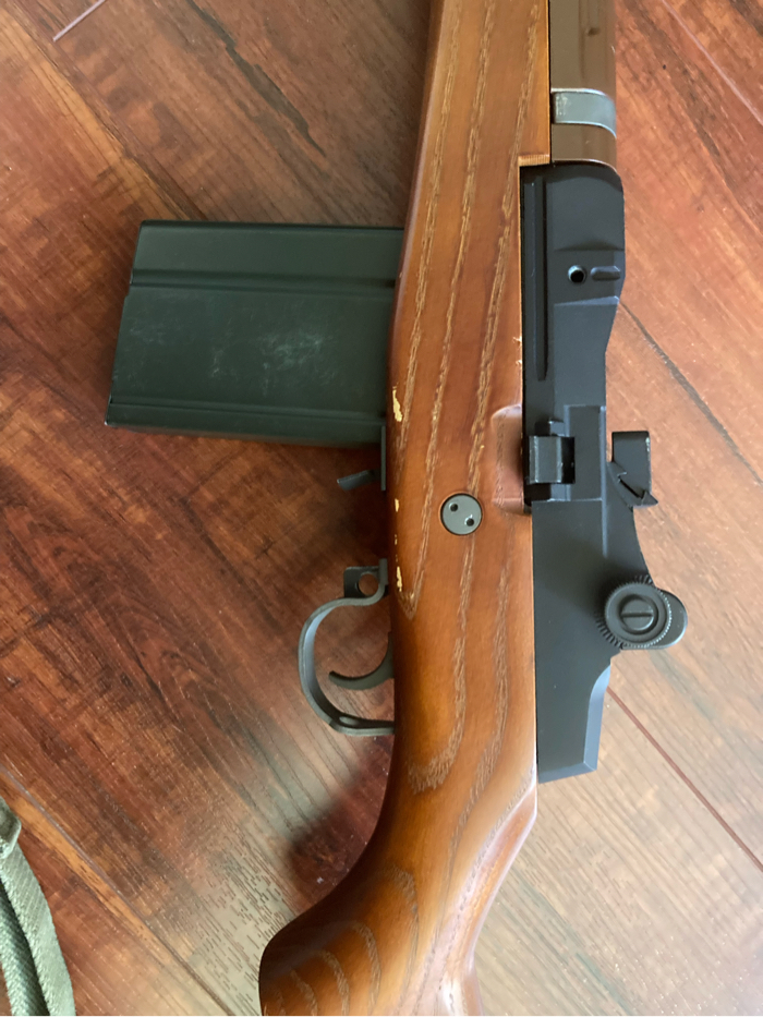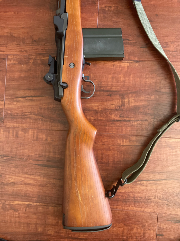 Real wood stock installed. Installed upgrades include the RA Tech Steel trigger group, tappet, bolt carrier, valve knocker, and slide lock. (Original parts, minus original trigger group, will also be included) Maple Leaf Crazy Jet inner barrel and ML HopUp bucking. Accessories include a rail adapter, Aimpoint style red dot (for the Black Hawk Down, Shughart M14 configuration), and canvas sling.