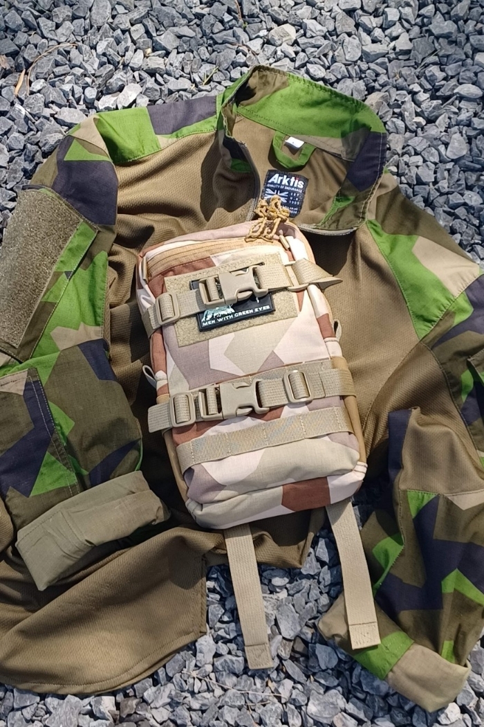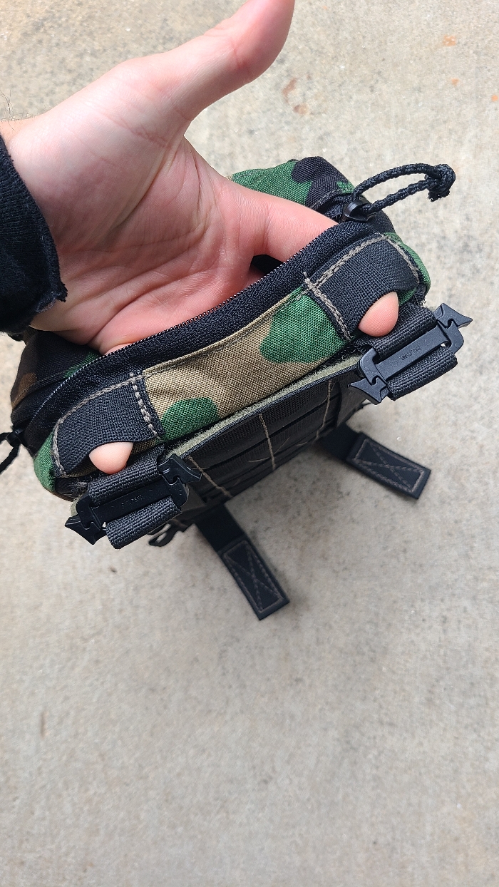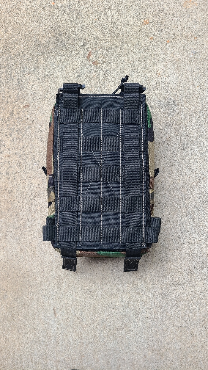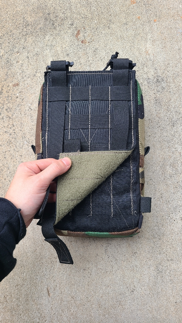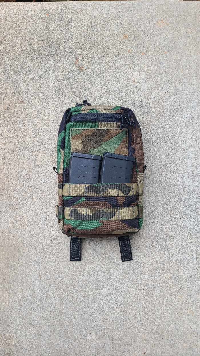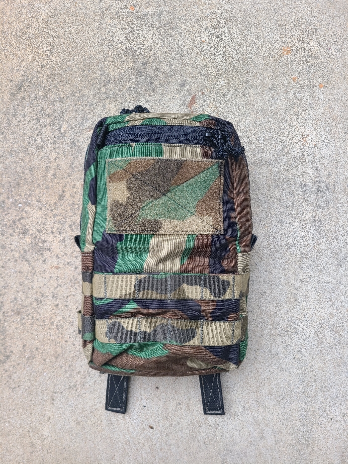Custom mini assault pack for rear plate bags. Backed with hook velcro, attaches with a velcro-to-molle mounting panel and 2 slik clips.