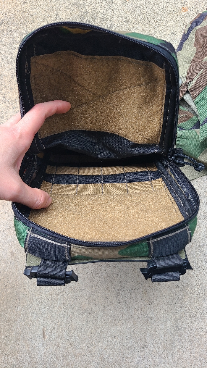- main bag compartment is approximately 12" x 7.5" x 3" accessible via half clamshell zipper. Main bag compartment is lined with loop velcron top with molle below, allowing routing of shock cord retention for hydration bladders or small HPA tank