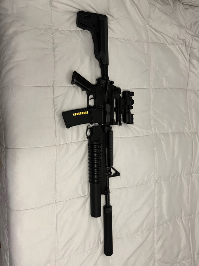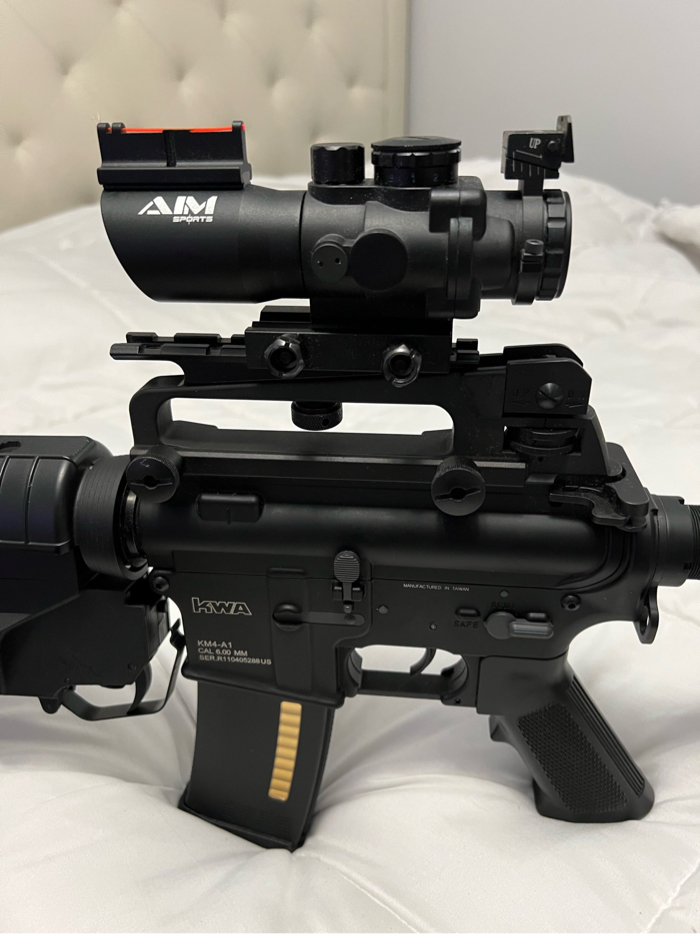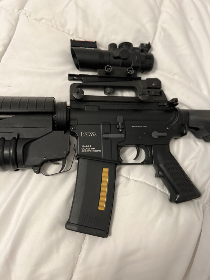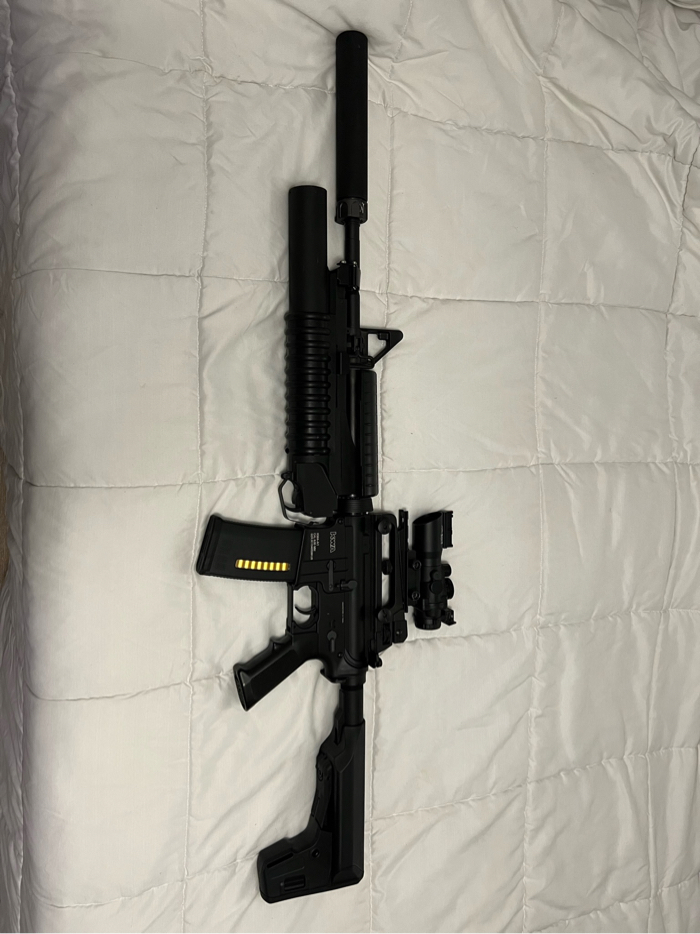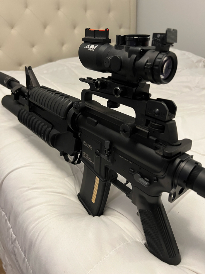 KWA M4A1 with M203 Grenade Launcher, mock suppressor, picatinny rail & AIM 4×35 illuminated compact scope with fiber optics sight. Has upgraded (& lengthened) Promethius inner barrel & has had batteries rear-wired for 5-position crane stock to accommodate M203 on fore end.