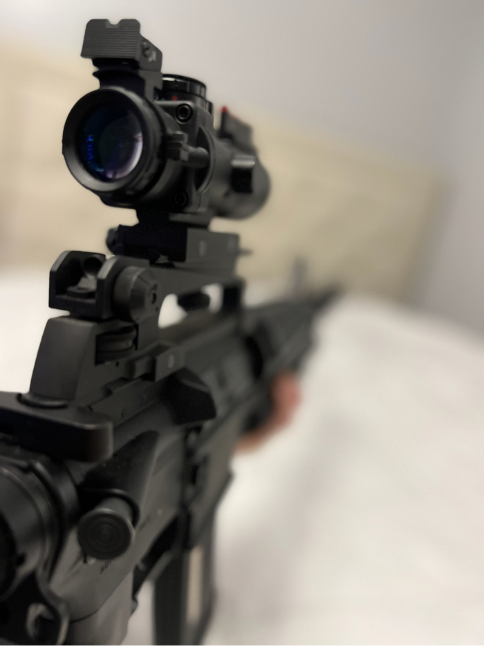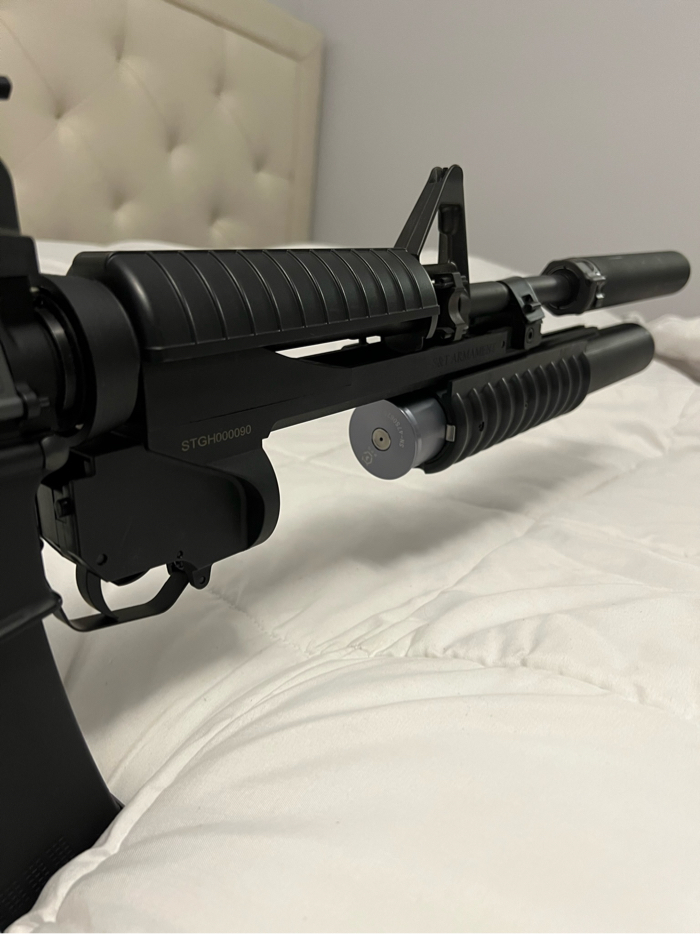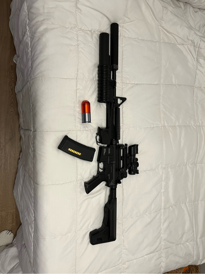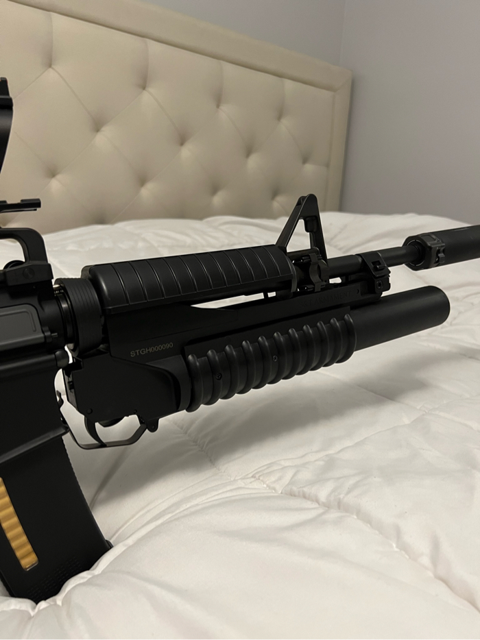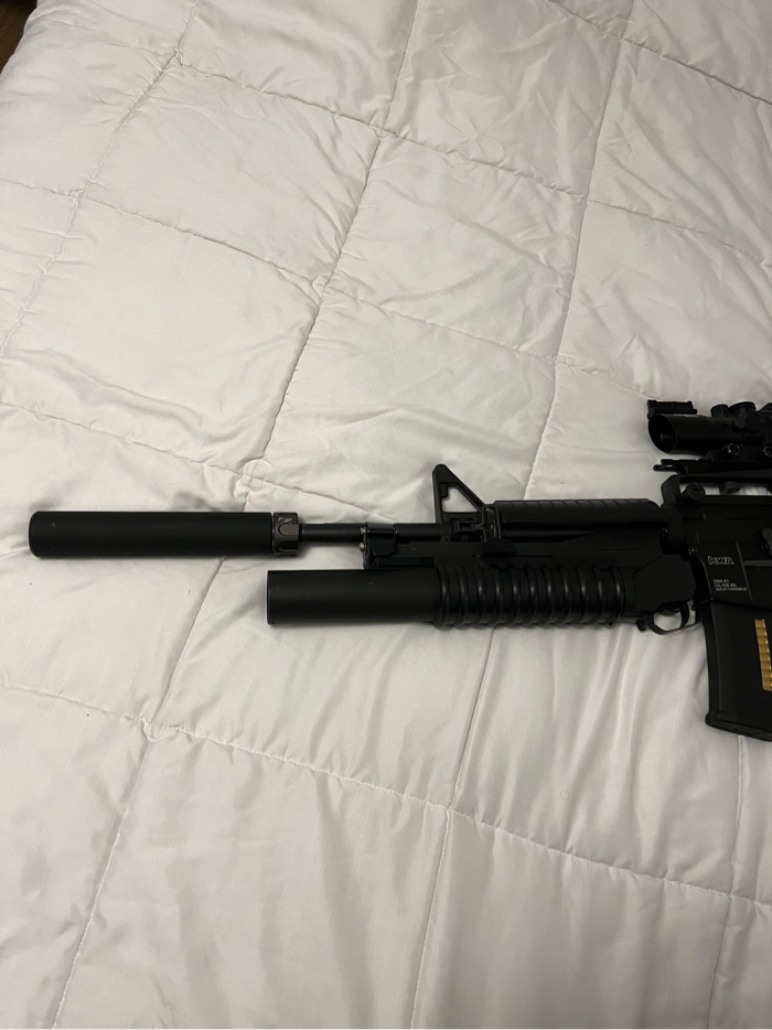 KWA M4A1 with M203 Grenade Launcher, mock suppressor, picatinny rail & AIM 4×35 illuminated compact scope with fiber optics sight. Has upgraded (& lengthened) Promethius inner barrel & has had batteries rear-wired for 5-position crane stock to accommodate M203 on fore end.