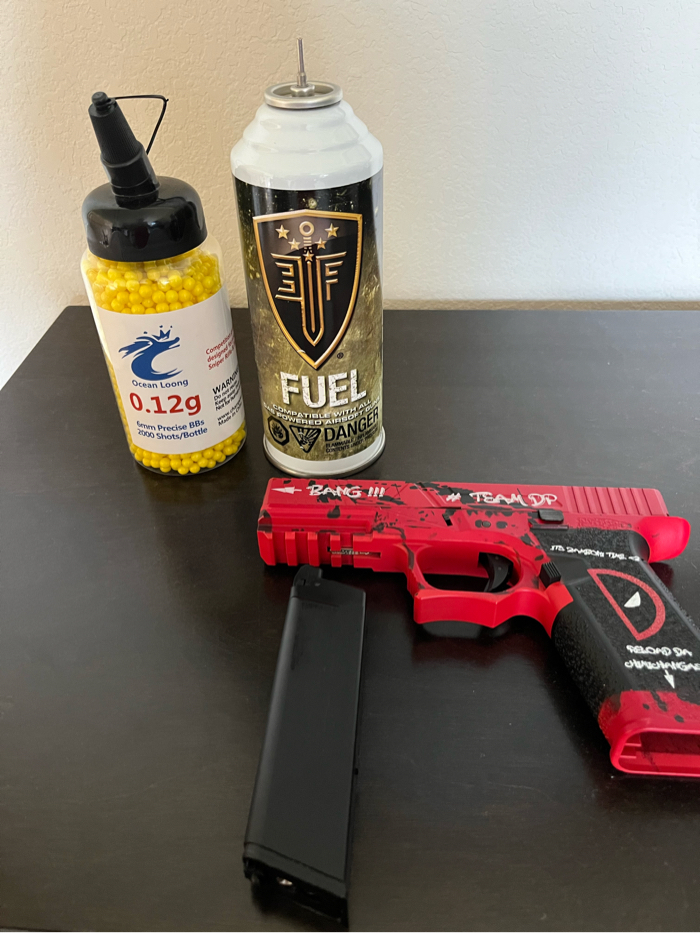 Comes with green gas can bbs gin and mag note!! Mag leaks gas you could probably fix it for like 5 bucks!! Orange tip didn’t come off right