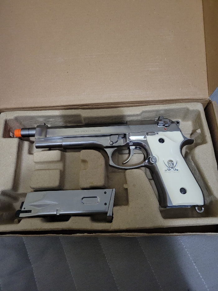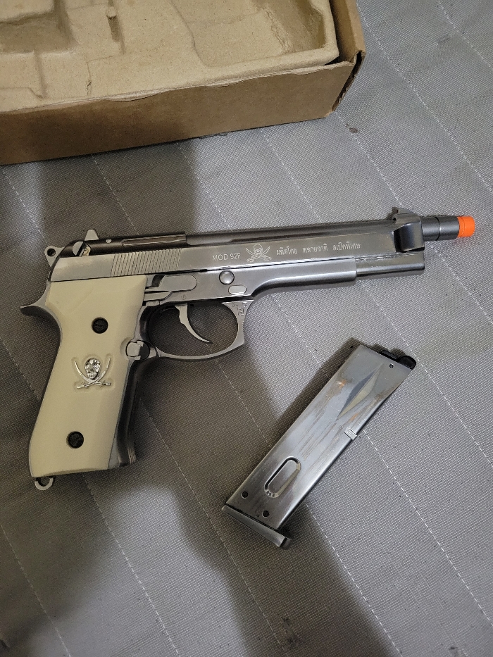 Lightly used berreta m92. All metal with synthetic Ivory grips and custom engravings. Gas blow back with a 26 round mag. Due to this guns power, it can only use .23 gram bbs and up
