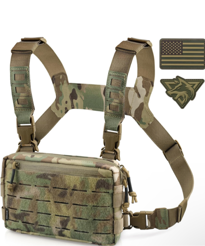 EXTERNAL EXPANDABLE: Chest rig has tailored some Molle on shoulder straps and facade loop to add Molle gears like tactical pen. The bottom has 6 drainage holes can also tie a TQ outside. Rear Hook-N-Loop area fits most dangler dump pouches then make chest rig setup complete.