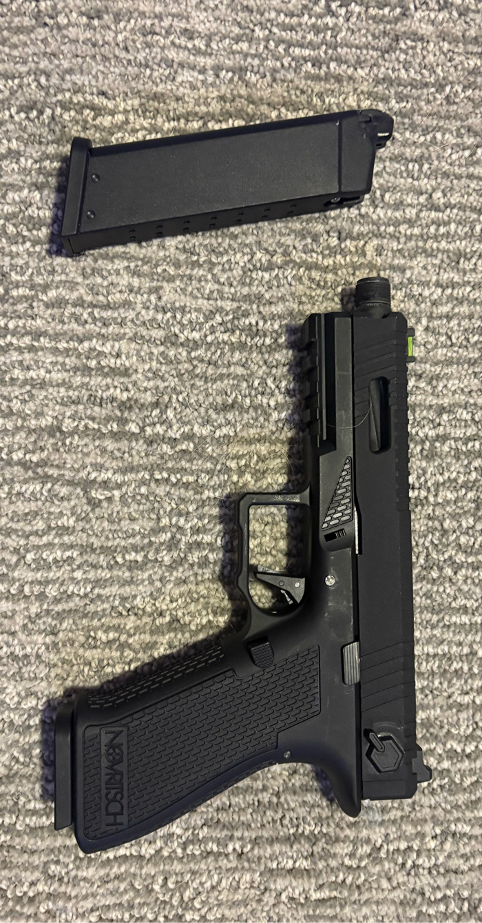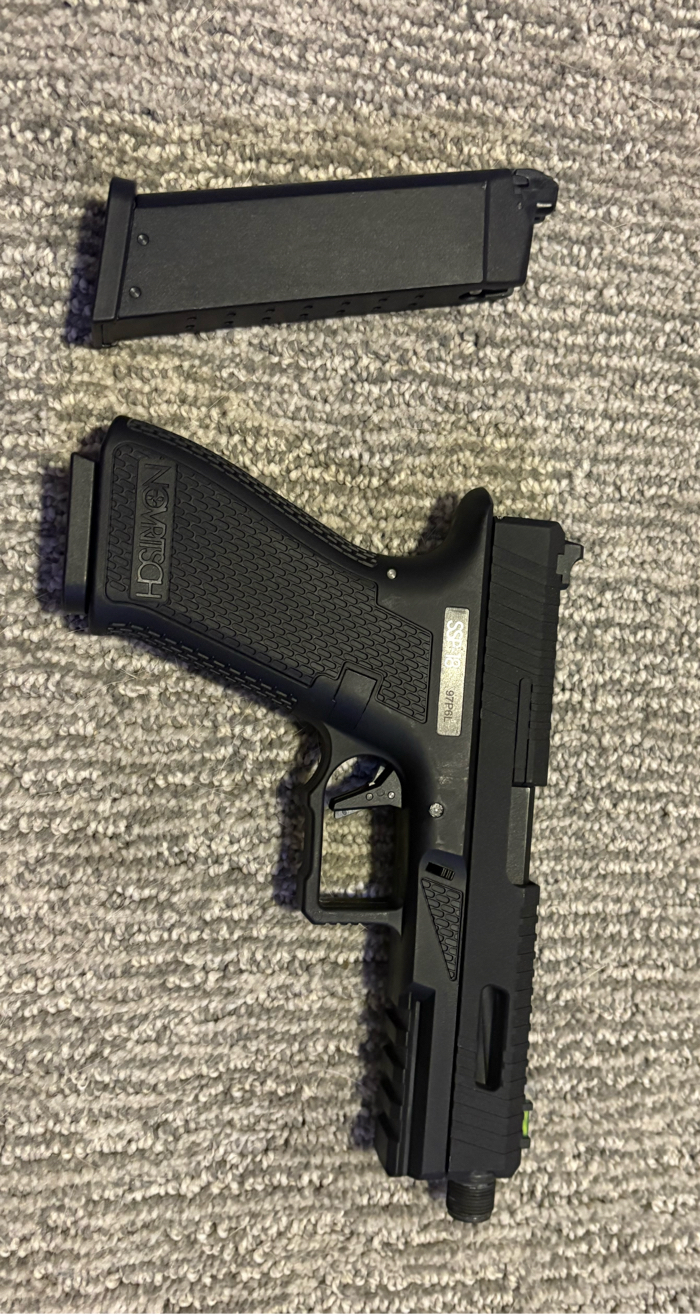 Practically new only been used on the field 3 times, works flawlessly. Comes with one extra mag (green gas). Has semi and full auto capabilities. Tons of room for customization for after market parts.