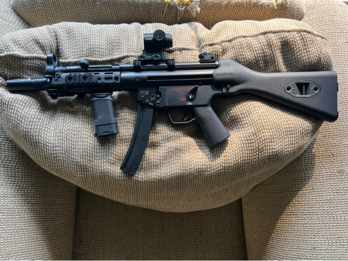 Vfc mp5 with a Gate Titan, mlok handguard, primary arms micro prism optic, acetech brighter C tracer unit, and stream light protac weapon light. It’s missing a butt plate but those are easily replaceable. It fell off during a game and I had no problems just playing without it. I also had a little custom shroud 3d printed for the orange tri-lug. Shoots like a dream. Rated for CQB, I think it shoots around 315 fps