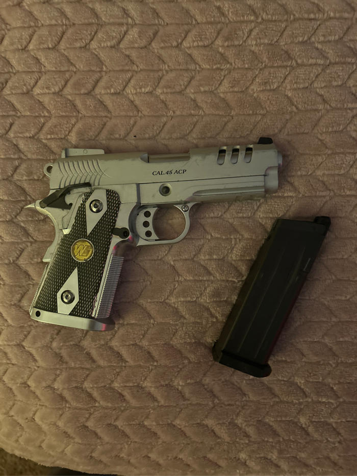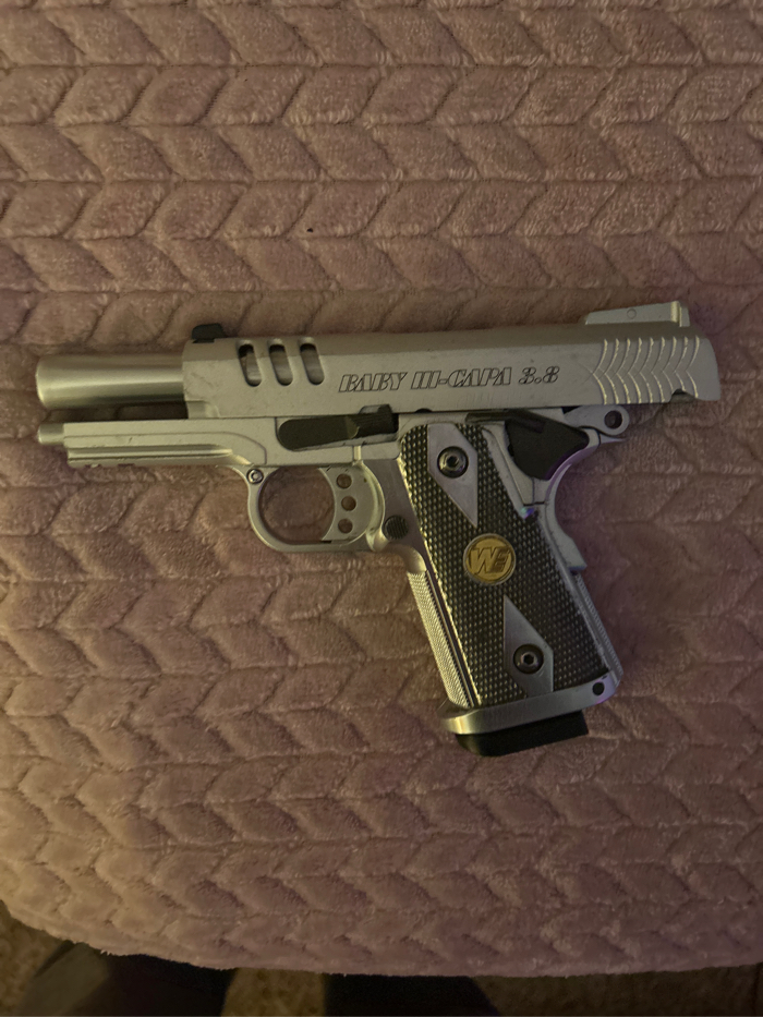 Silver 3.8in barrel 1911 Hi-Capa GBB pistol. Fired 2 or 3 times so it’s in great condition. Very solid feel and good FPS power. Great for a back up piece.