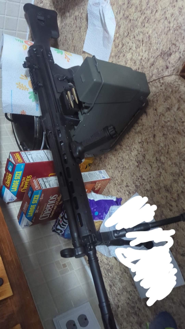 Comes with a custom box mag that took me forever to 3d print and build, holds 6000 rounds and feeds extremely well.