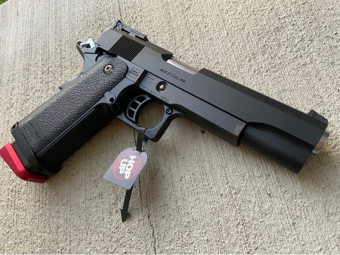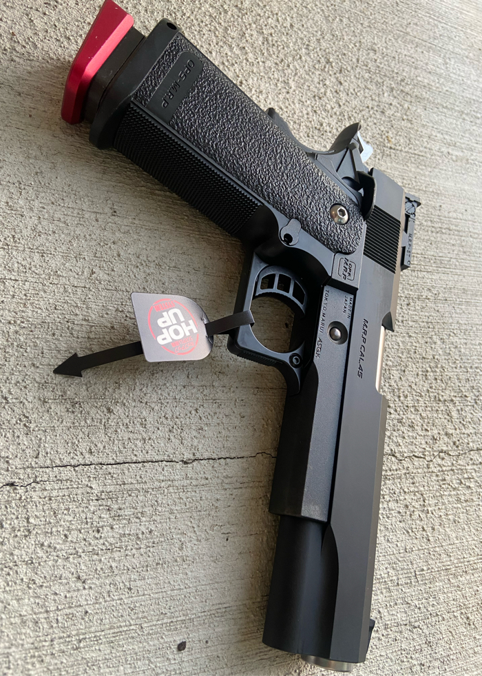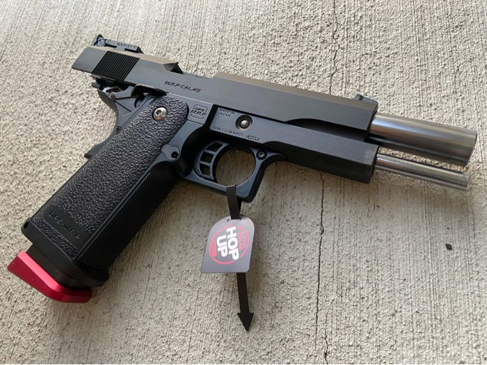 with Tokyo Maruis Hop up granting it incredible accuracy and precision. Has new Spring guide/ guide rod installed for faster rate of fire and snappy trigger response. Upgraded TM magazine with o ring / valve for better gas flow and FPS. Reinforced nozzle spring to handle GG mags. Red base plate is sold but will come with OEM black one