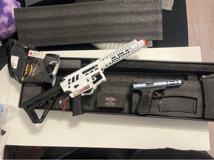 EMG/APS F1 AR-15 PDW, and a WE Galaxy