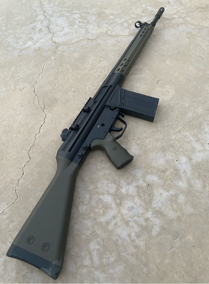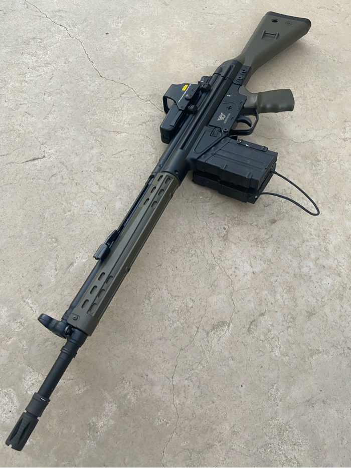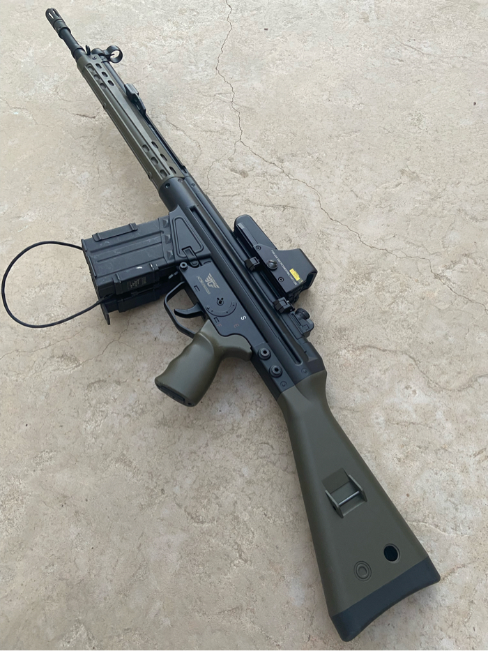 Selling a pristine condition / New Heckler & Koch G3A3 DMR style electric air soft rifle in OD Green color. Realistic, quality build, with high performance internal parts.