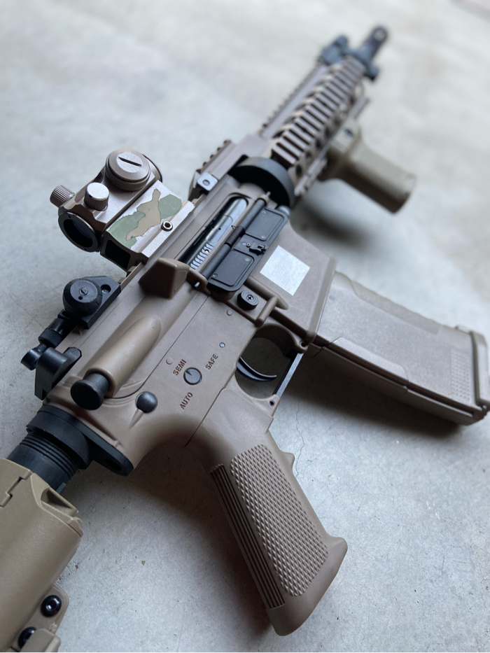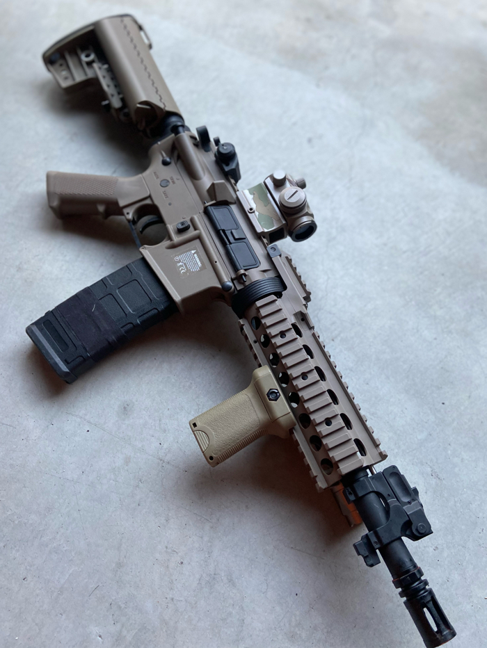 Durable and reliable build quality. Uses Tokyo Marui spec gearbox. Features a quad rail system, easy to customize and accessories with Scopes, forgrips, TAC lights, PEQ boxes, lasers and much more.