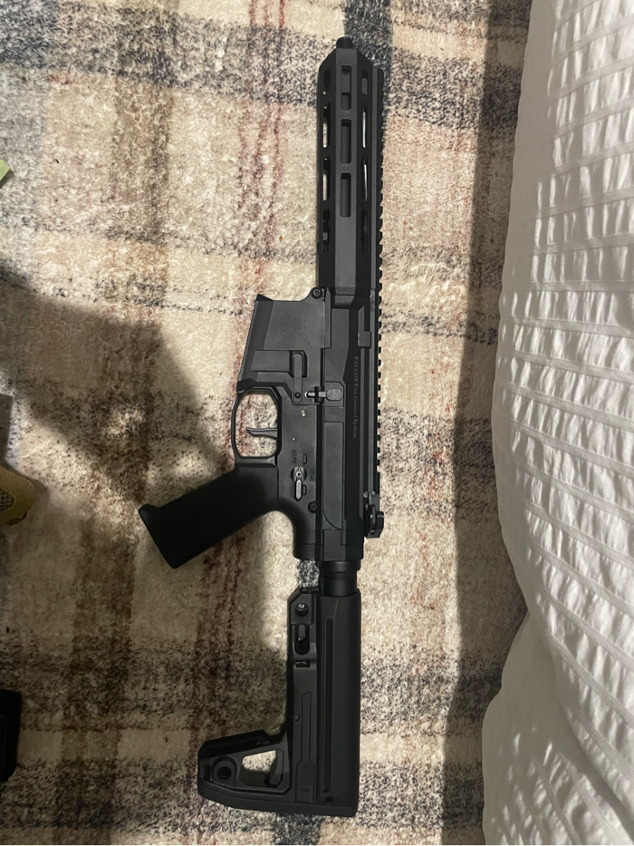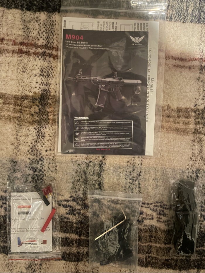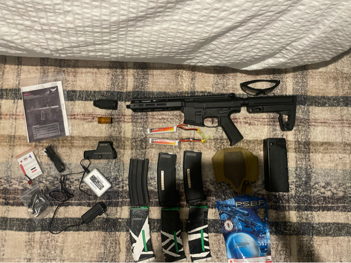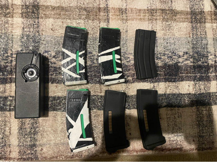 I’m selling my AEG M4, been used 3-4 times like new. No scratches or issues. Selling two 11.1v Lipo batteries with charger. Selling six mags, five mid caps, one high cap. Colorful mags are evike bamf mags with a pts epm spring in them. The scope is a Eotech Replica, no scratches or scuffs on lense in good condition. Suppressor is foam filled. Goggles and mask, goggles no scratches, mask covers ears and face never been shot. Speed loader has to be held on mag (lever broke). The m4 has an upgraded motor, asg boost 40k, also has a programmable etu.Asking $360 OBO.