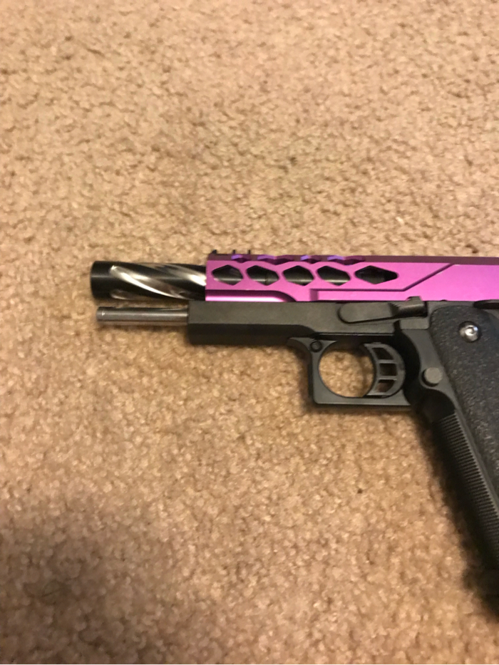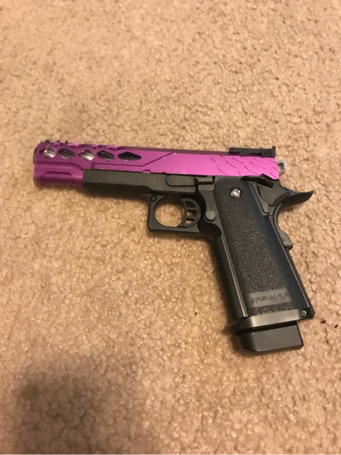 his beautiful piece of art is a semi upgraded Tokyo Mauri 5.1 Hi Capa. It has an upgraded slide, outer barrel, and guide plug. Shoots great and has never been fielded before. Open to trades and offers. Please feel free to ask me questions. Thank you so much!
