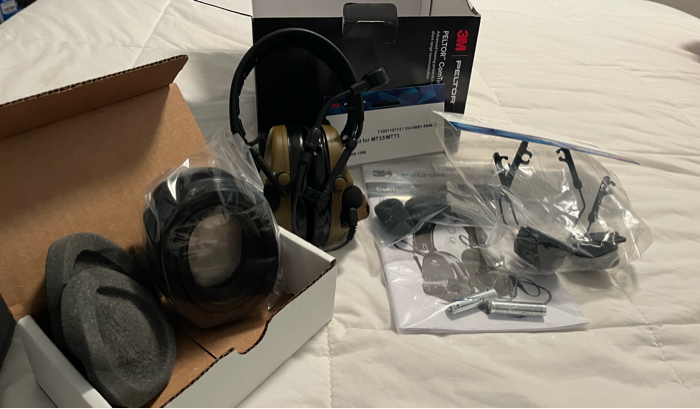 This is a brand new headset by Peltor. It has not been used! The headset includes batteries, extra cups, a mic and a warranty.