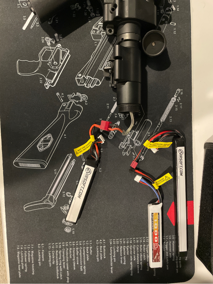 Comes with 3 batteries as shown and a lipo safe case and charger. The shortest Airsoft.com one fits in the stock. Mags are mid cap with I believe 40bb capacity. Three metal ones and the stock plastic one. Everything works fine as I said i barely used it and it has been collecting dust. The selector does like to skip semi and jump to auto if you aren’t careful with it.
