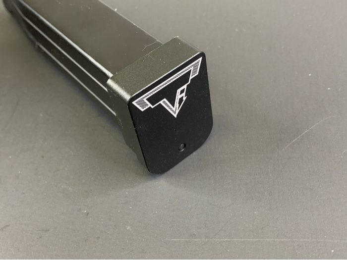 Custom aluminum base plate with Taran Tactical logo laser etched on. The base plates also feature indexing points which make grabbing the magazine much easier.
