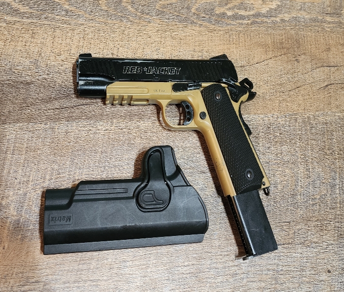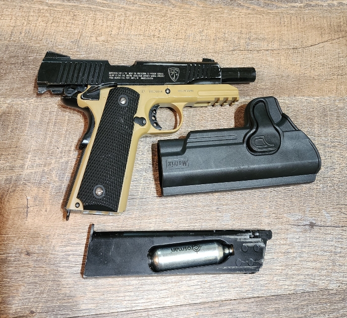 Here is an awesome sidearm starter setup. With the renowned KWC 1911 TAC with plenty of parts availability, you cant go wrong! Comes with one extended CO2 1911 Mag and holster as shown.