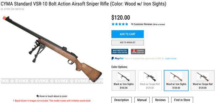 CYMA Standard VSR-10 Bolt Action Airsoft Sniper Rifle (Color: Wood w/ Iron Sights) Bipod shown in images not included. $120 on Evike. Accept offers