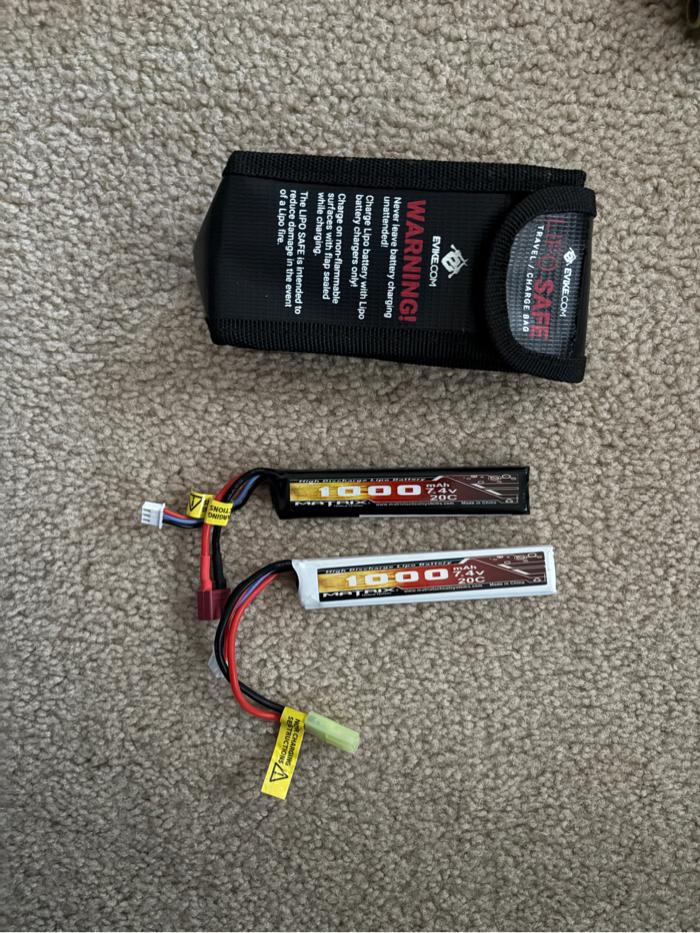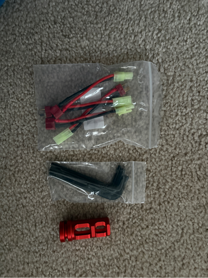 KWA VM4 Ronin Tactical Series (AEG 2.5) Rifle, with two chargeable batteries, a black & orange muzzle, Valken Reticle Dot Reflex Sight RDA30, and necessary tools.
