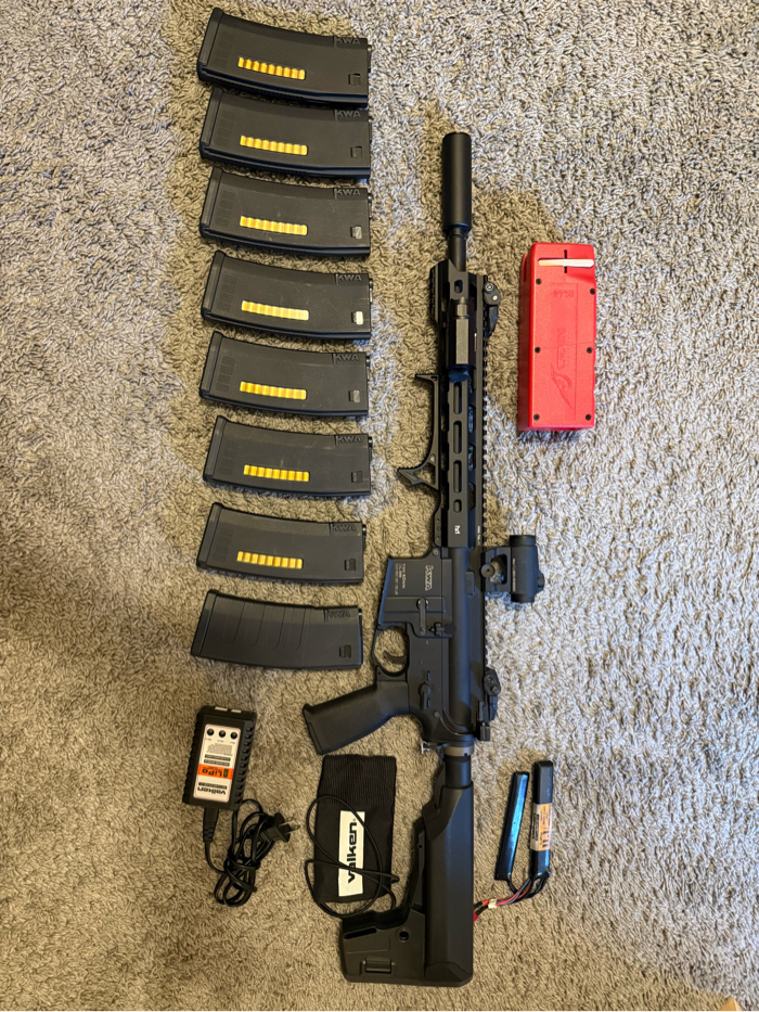 Also included is 1. 8 KWA ms120 mags 2. ODIN Innovations speed loader 3. Valken Barrel Cover 4. Valken gun bag 5. Valken LiPo Battery Charger 5. 11.1 LiPo Battery