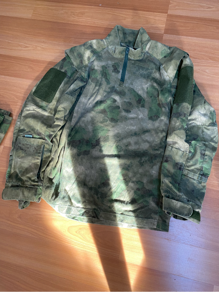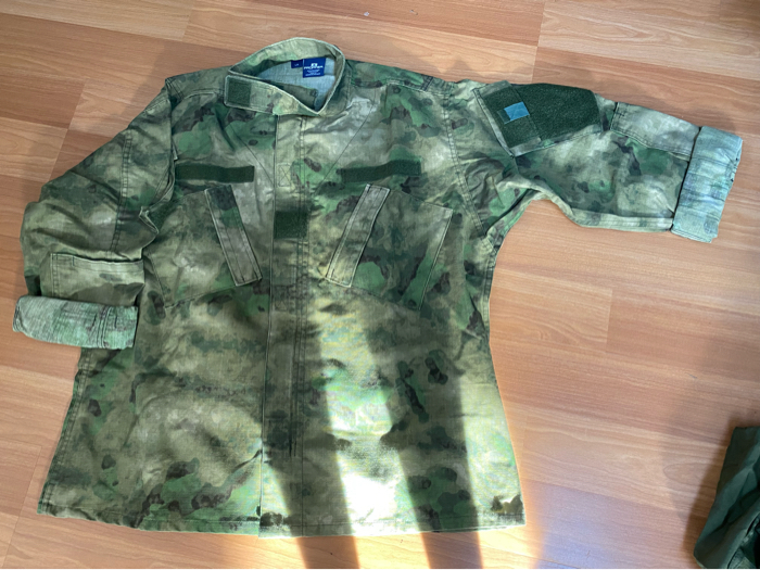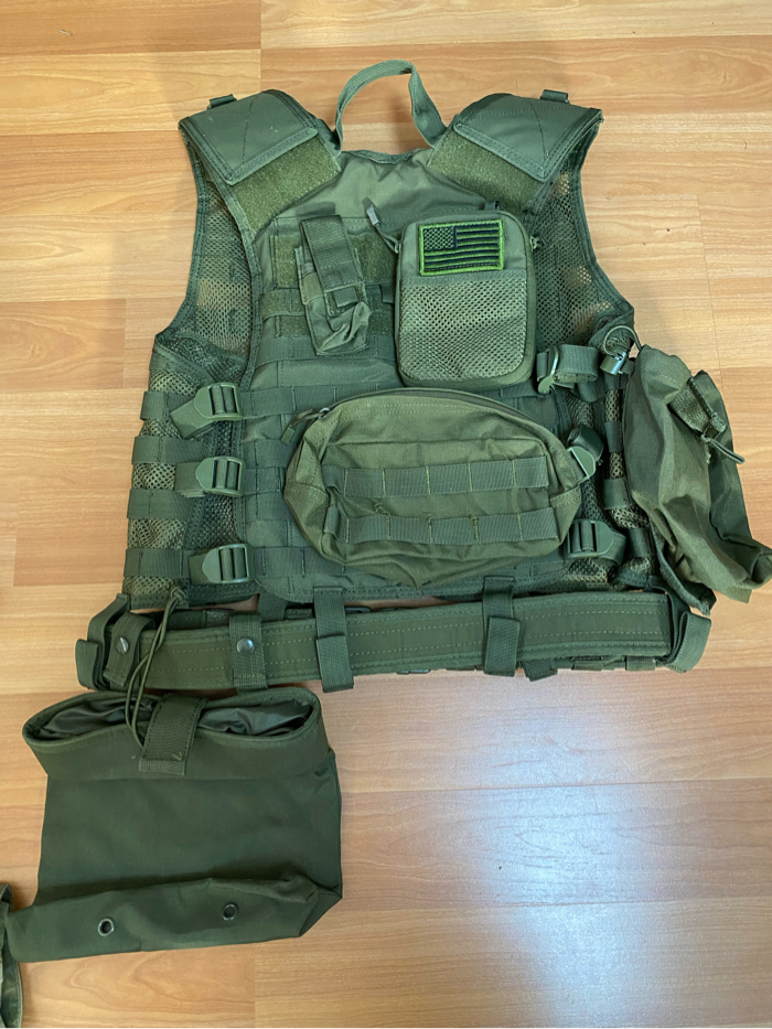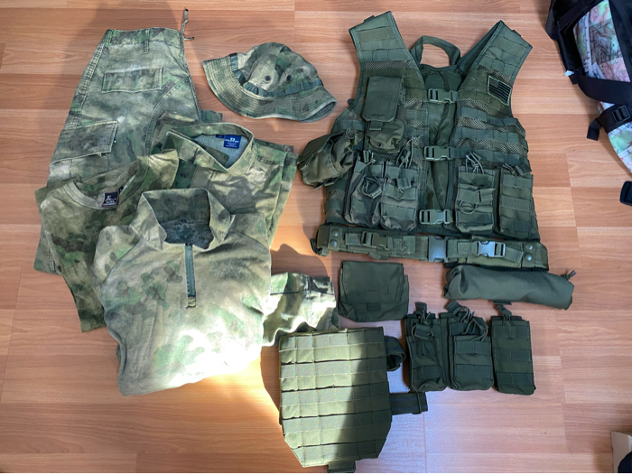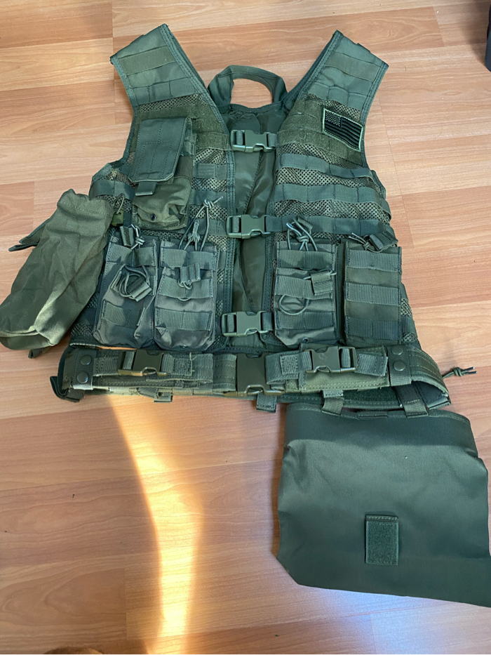 Complete OD Green Tactical Vest with tactical belt, variety of molle pouches on front/back (refer to photo), and dump pouches. Molle thigh attachment. 3 extra mag pouches and small pouch. A-TACS uniform by Propper includes long sleeve combat shirt (Large), Combat Jacket (Large), cargo pants (Medium, Regular length), Boonie hat. Short sleeve A-TACS operators shirt by Tactical Performance (Large)