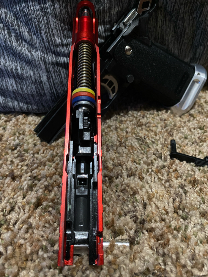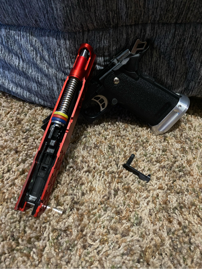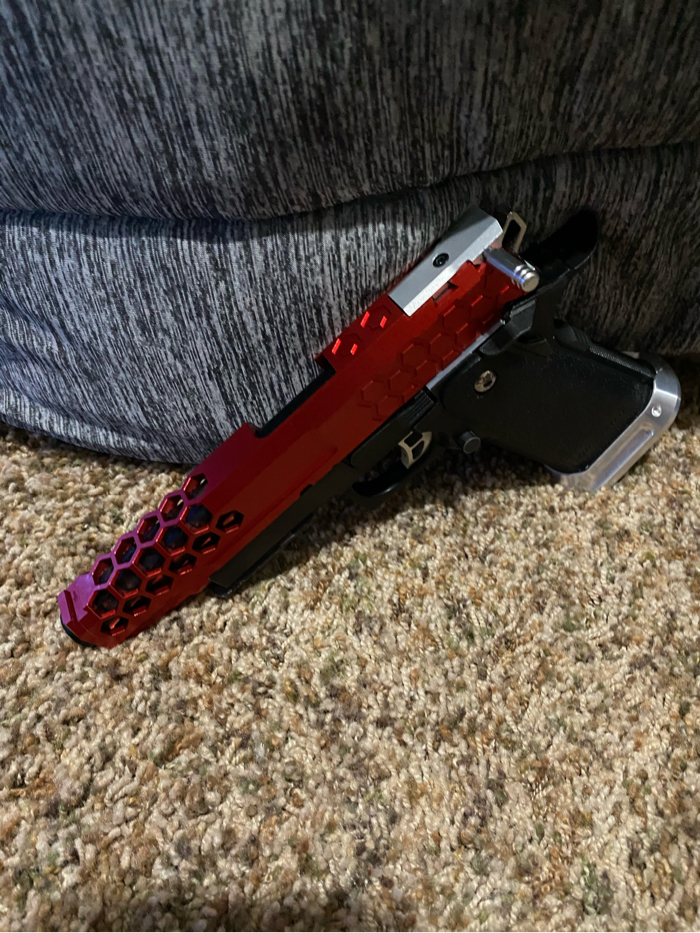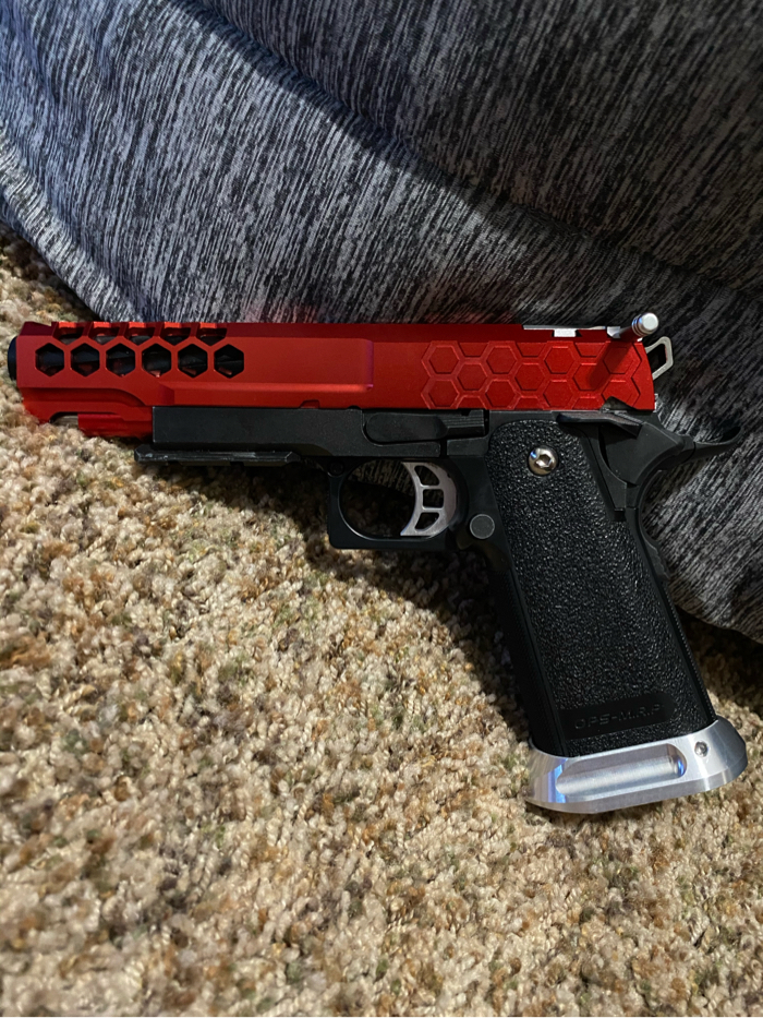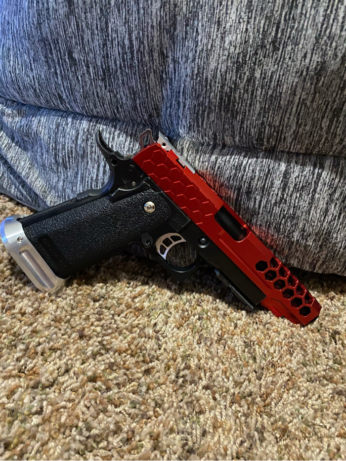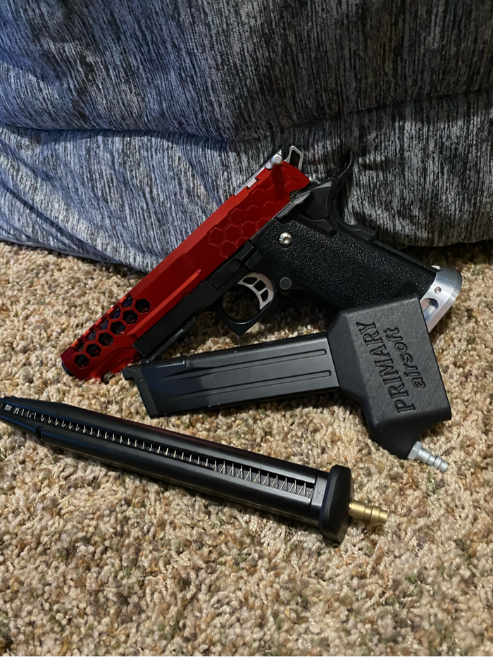 I am selling a Tokyo Marui 5.1 hi capa that has been highly upgraded. This hi capa comes with a 50rd tapped mag and a primary airsoft m4 mag adapter! This gun runs super smooth and crisp. Selling because I got out of the sport. Has been kept in a hard case it’s while life and has been lubed regularly. Like new condition!! Upgrade list below! Price not super firm. No lowballs please. Thank you for looking!! Buyer pays shipping.