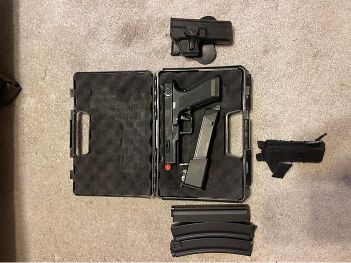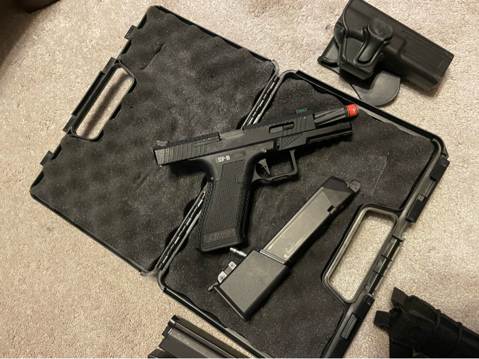 Ssp18 Comes with holster,adaptor, 5 mags, case, one mag pouch, and a purple adjustable trigger.