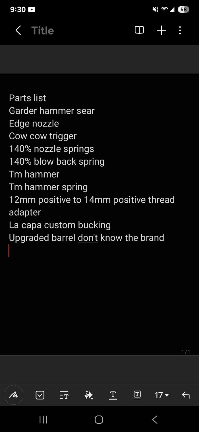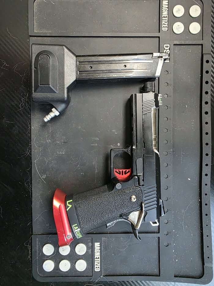 I have owned this hi capa for about a year and a half. It is one of my favorite guns to use. The parts list is shown in the pictures feel free to message me for more. I used it for speed soft but am in need of the money right now as I have more important things needing to be taken care of. The slide is metal, I cut the slide to save weight. Shoots amazingly and very fast. I hate to see it go but I need to let it go. The hpa adapter will come with it and I'm pretty sure I have a spare TM green gas mag that I will throw in if I can find it. The safety does not work as I had to shave it down to make the hammer sear work. The golden eagle hi capa is TM compatible as I am running TM parts in it. If you have any questions or would like a video of it shooting feel free to ask.