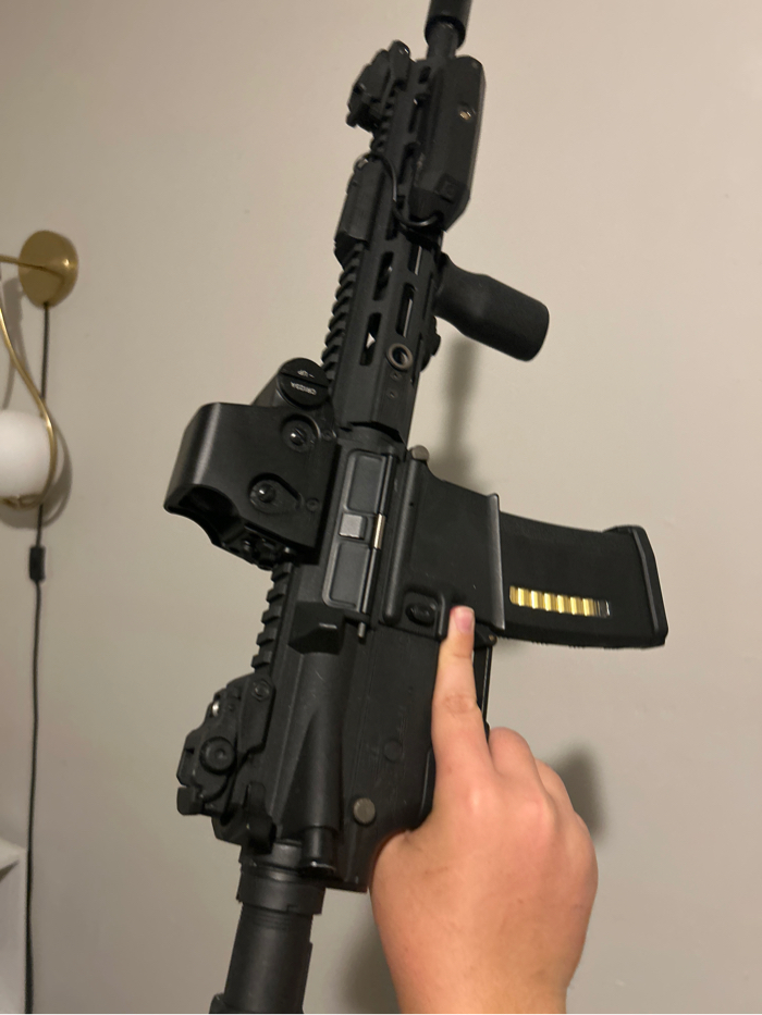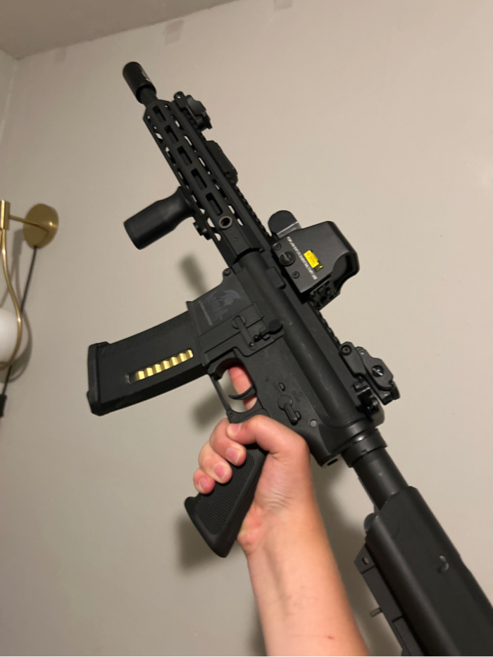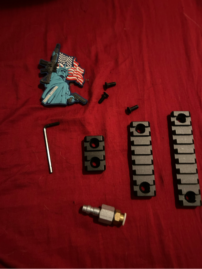 • Comes with: high-cap mag (stock), EPM-1 mid-cap mag, red dot sight (bright—looks bigger in pics), m lock Picatinny rail adapter, vertical foregrip, flashlight w/ pressure pad, smart charger (no battery)