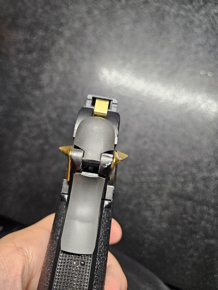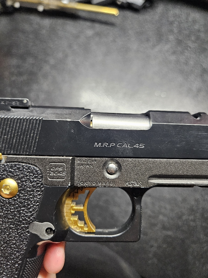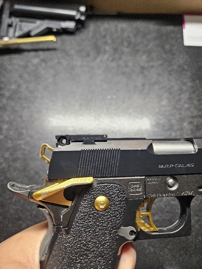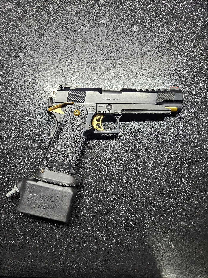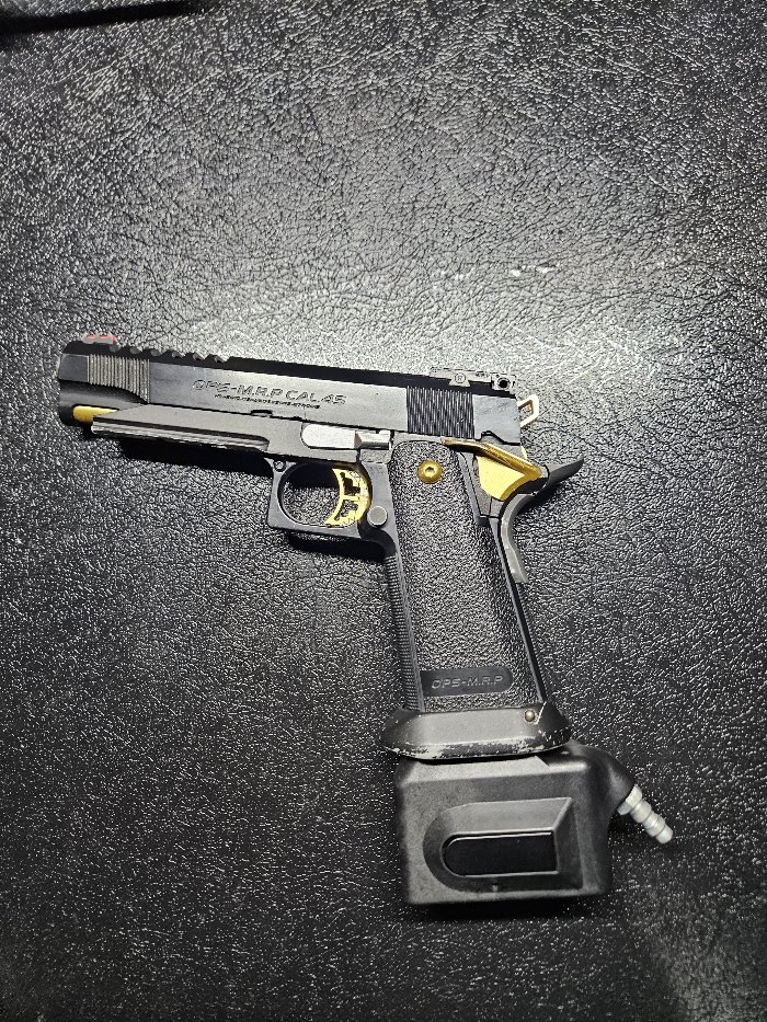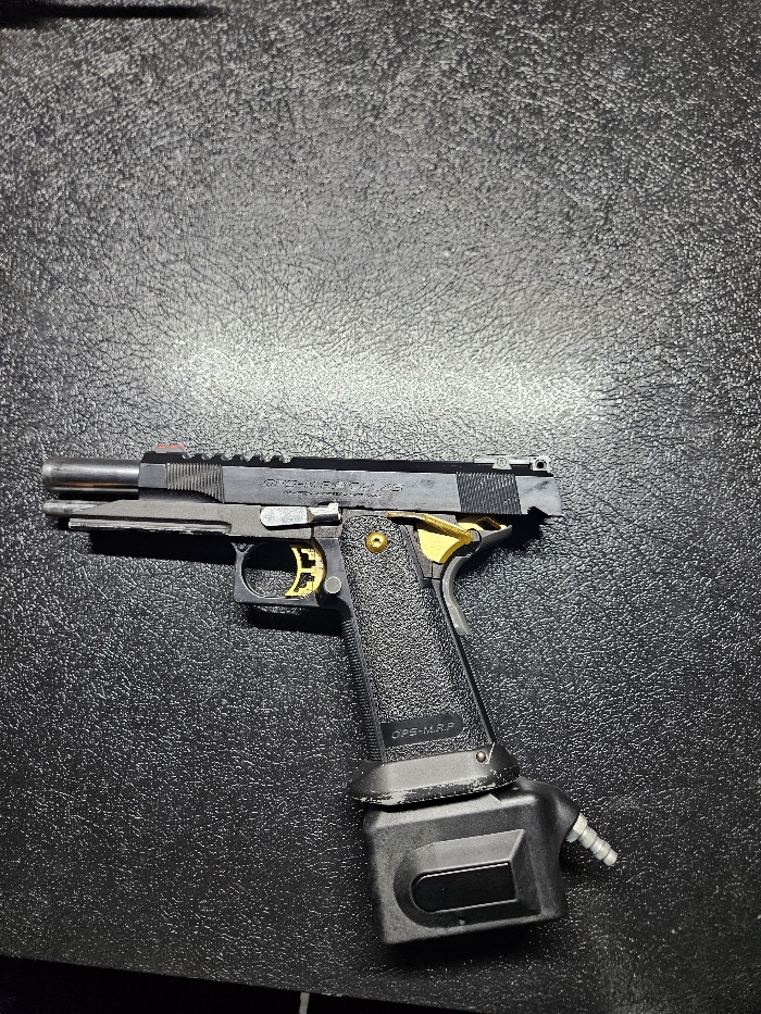 Tokyo Marui 5.1 hi capa, gold match, broken beaver tail and missing rear sight, threaded barrel needs adapter, primary hpa adapter with mag