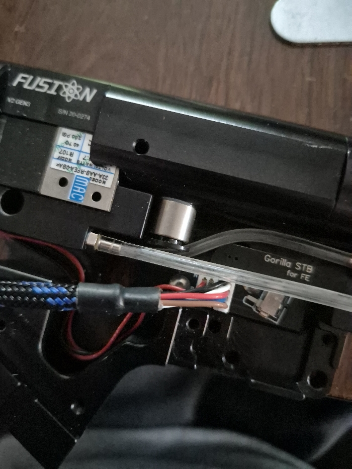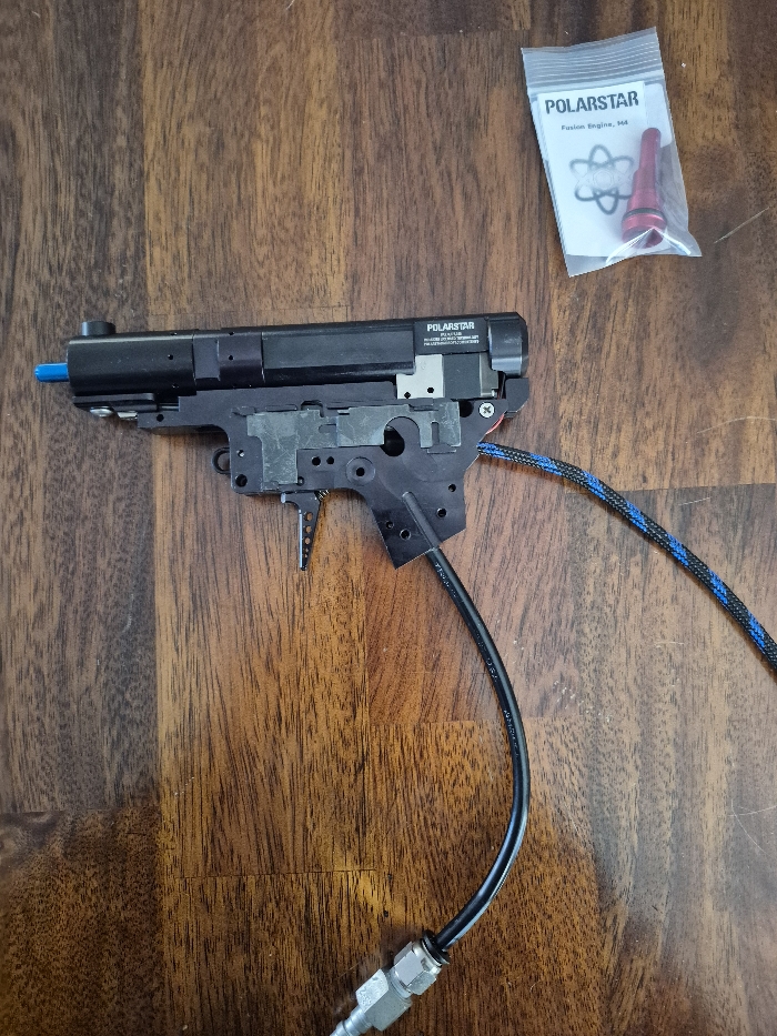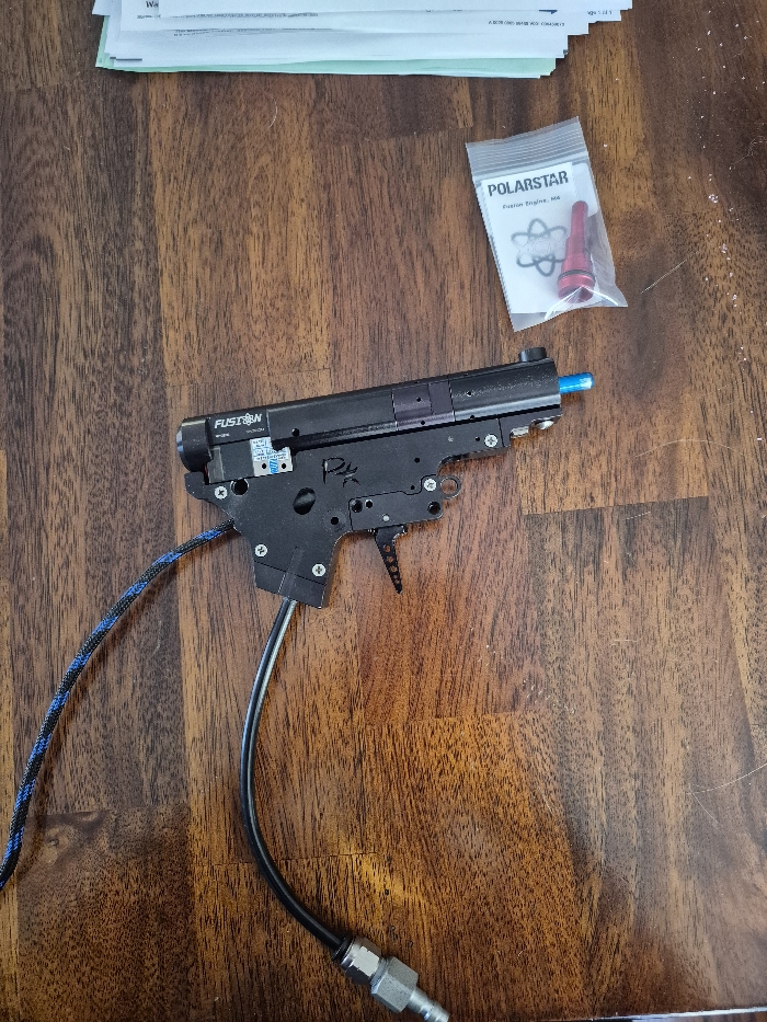 gen 3 fusion m4 blue & red nozzle I believe a blue poppet gorilla trigger board
