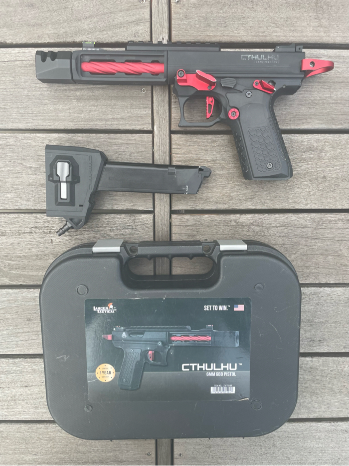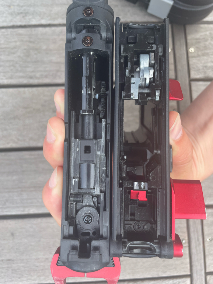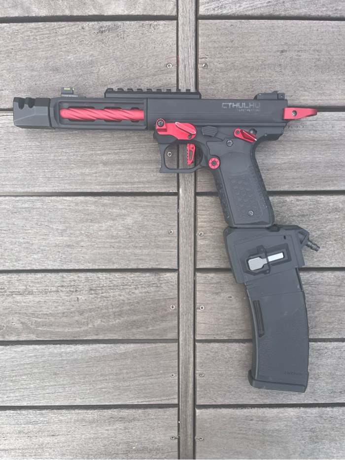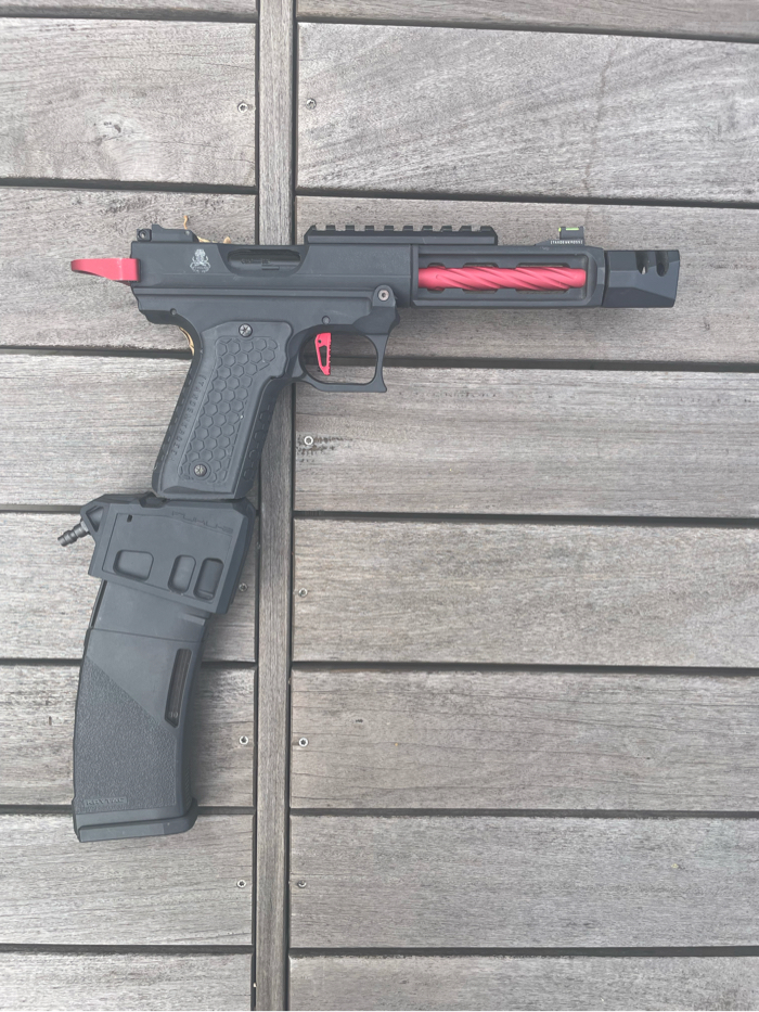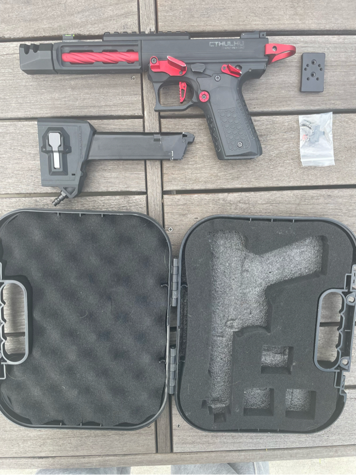 two problems, only shooting full auto, smth isnt working with the fire selector but thats like $12. and in the last photo you can see the slide release needs to be screwed onto the thing which i cant figure out how to do, its not broken i swear🙏 . other than that it works great and shoots fine. offer trades if u want. btw everything but the krytac mag is included, if you have glock mags you could run with those too. its a glock hpa adapte
