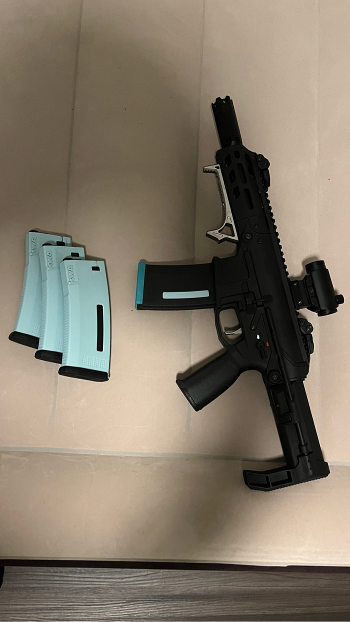 New KWA eve-4 with internal upgrades and external accessories. I have not used this in any games yet. The gun has been tuned with a quick trigger response and testing the gun it shoots perfect. NO Trades please