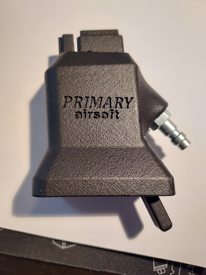 This is a custom designed laser sintered nylon adapter that allows you to use HPA (high pressure air) and X-9 AEG magazines on your Hi-Capa airsoft pistol.