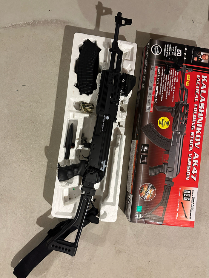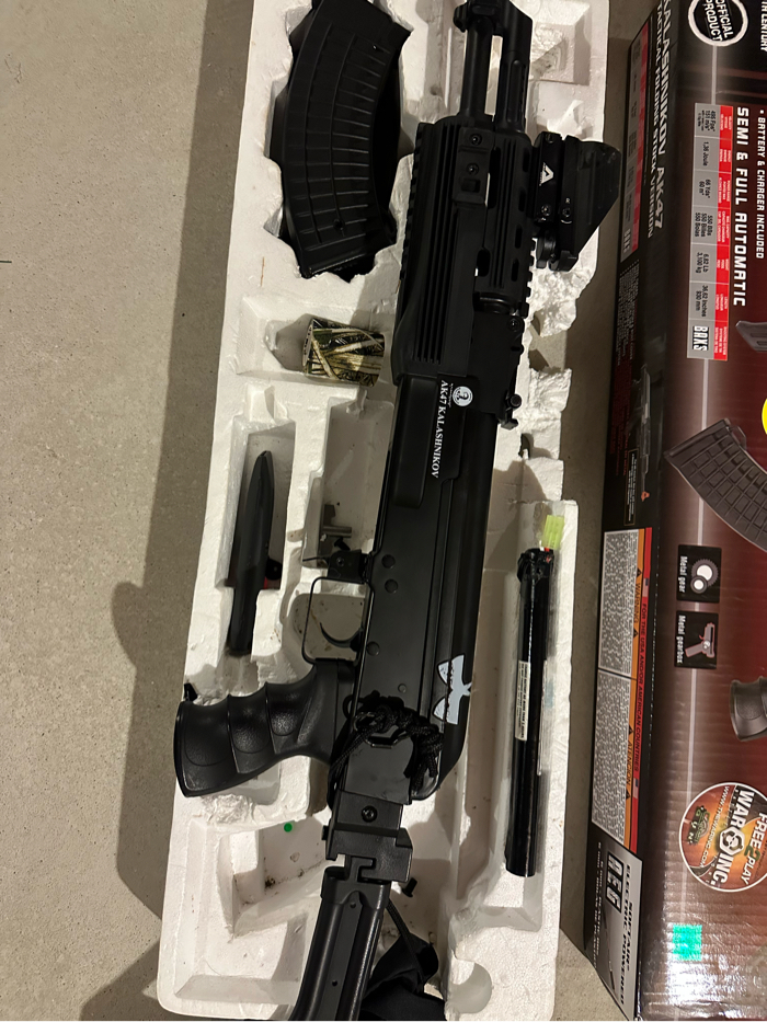 Fantastic rifle for beginners and intermediate players. Full metal casing and barrel with polymer grip and folding stock. Shoots straight and hits hard. No major scratches or dents anywhere. This gun was babied just don’t have enough time to play anymore and are trying to find a new home for this AK!