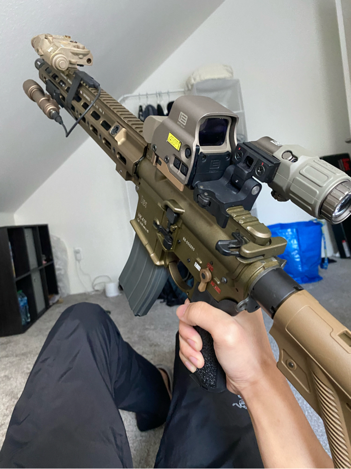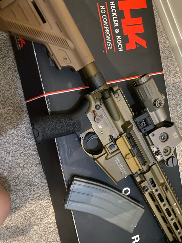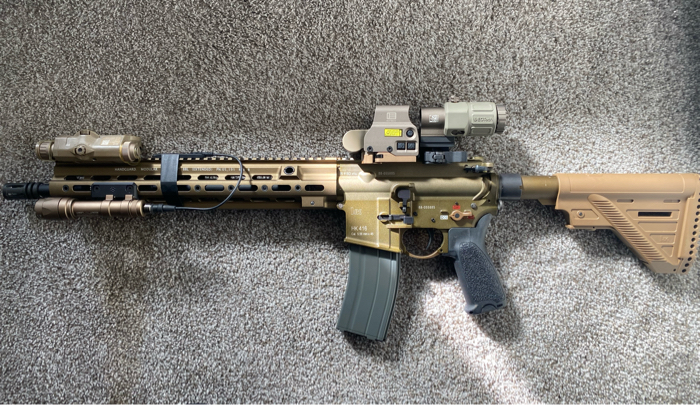 Details: Originally an Asia Edition VFC HK416 Outfitted with a 4.5inch barrel extension to push for a 14.5 totallength. Rail swapped to a Geissele SMR rail. Electric tape on barrel nut for secure fitment.