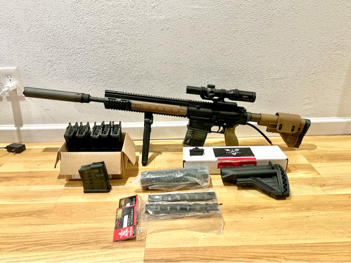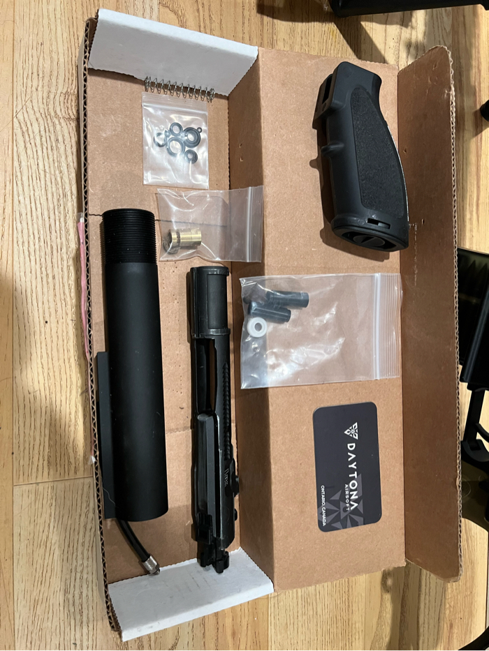 - also includes 417 rail, buffer tube, grip, and folding rear sight to convert back if desired