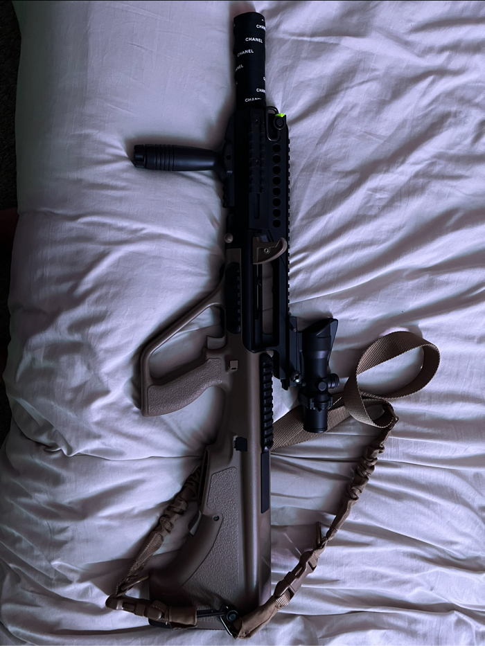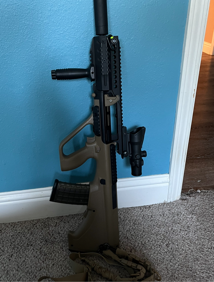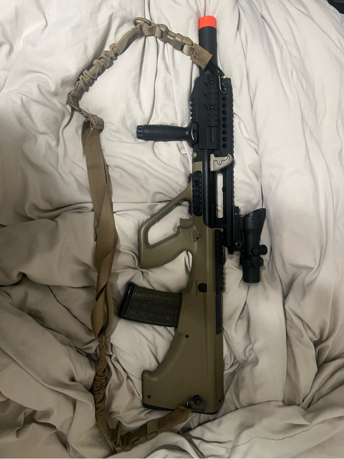 an AEG AUG A3 i used it twice good fps strong accurate fun i js want a lighter dmr it has battery less acog scope 4x front grip sling and 3 magazines 2 hi capa 1 wind with 2 speed loaders (NO BATTERY) and sling