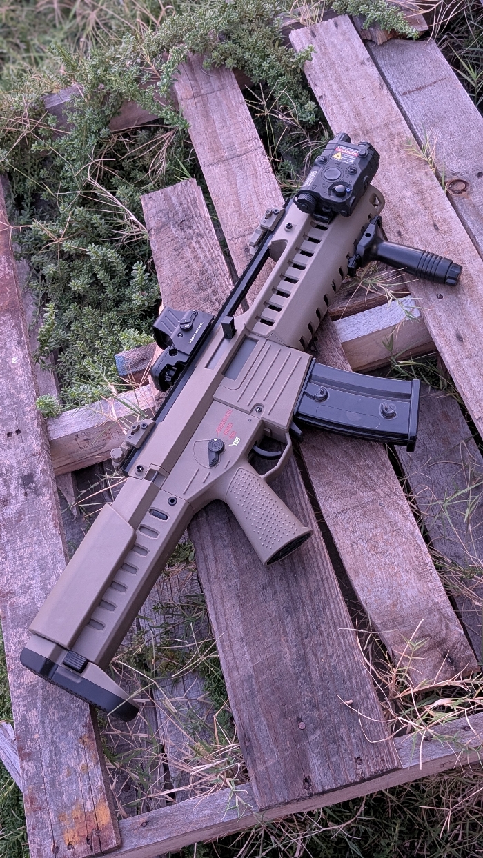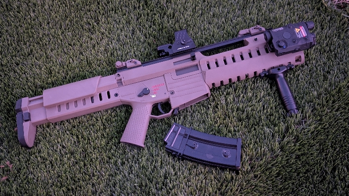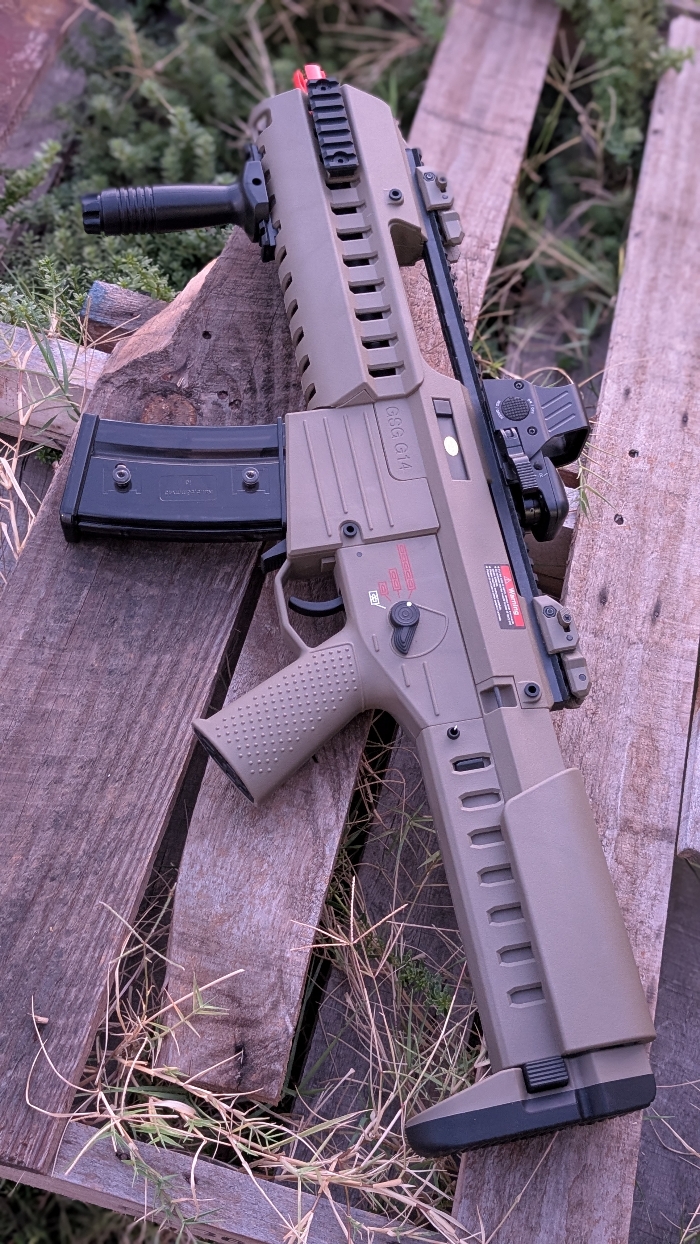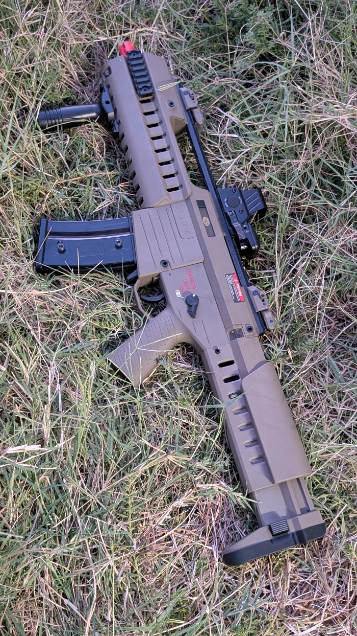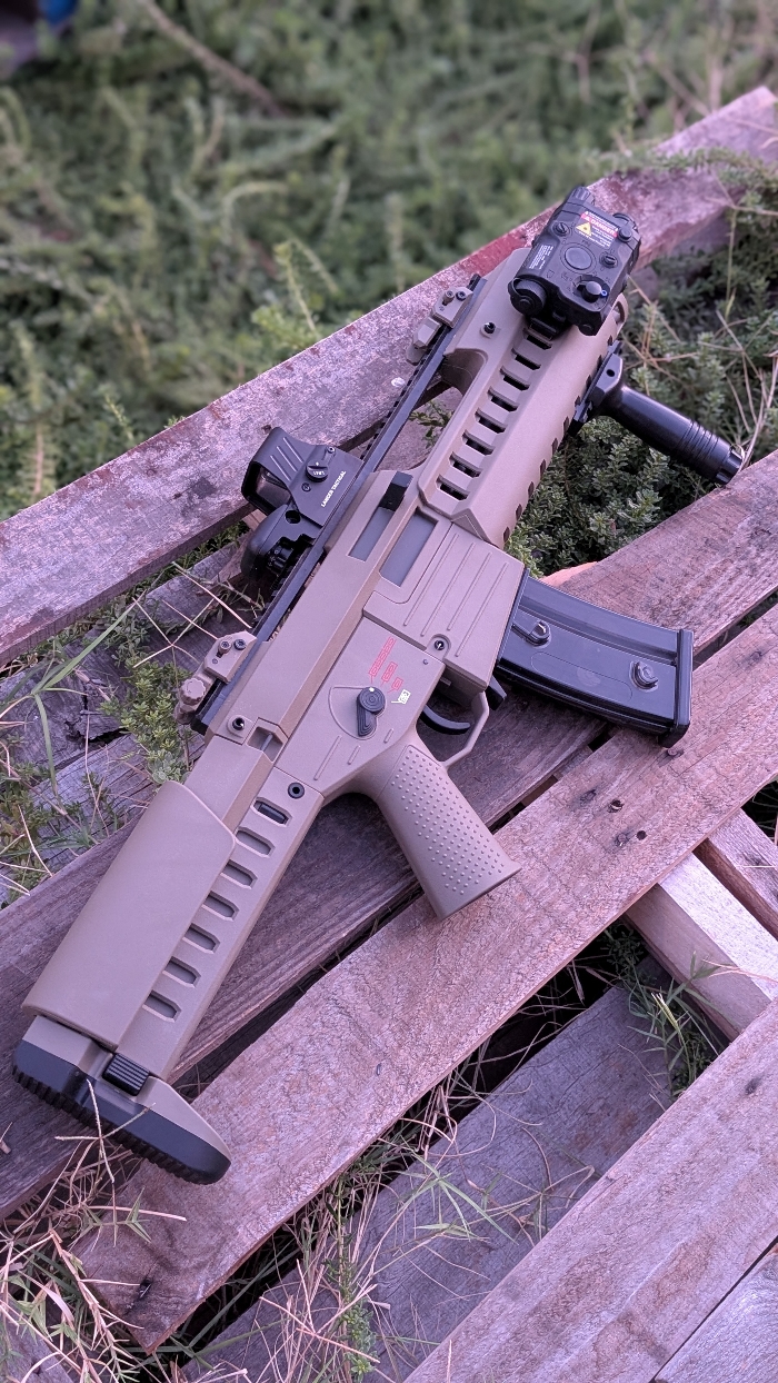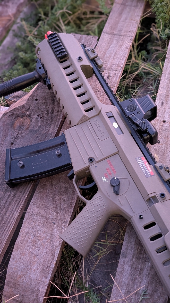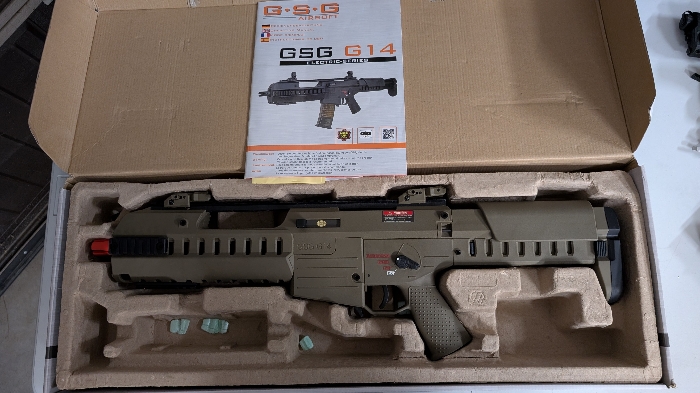 Selling a BNIB condition Dark Earth GSG Tactical G14 Carbine by Ares with Electric Blowback! A unique spin on the classic G36 Rifle, but with an even more futuristic styled look to it than before!! Features a modular handguard with optional rail sections, adjustable 7 position stock, picatinny mounts for grips/lights/lasers, a built in carry handle with extended top rail for optics mounting, and a built in EFCS mosfet!