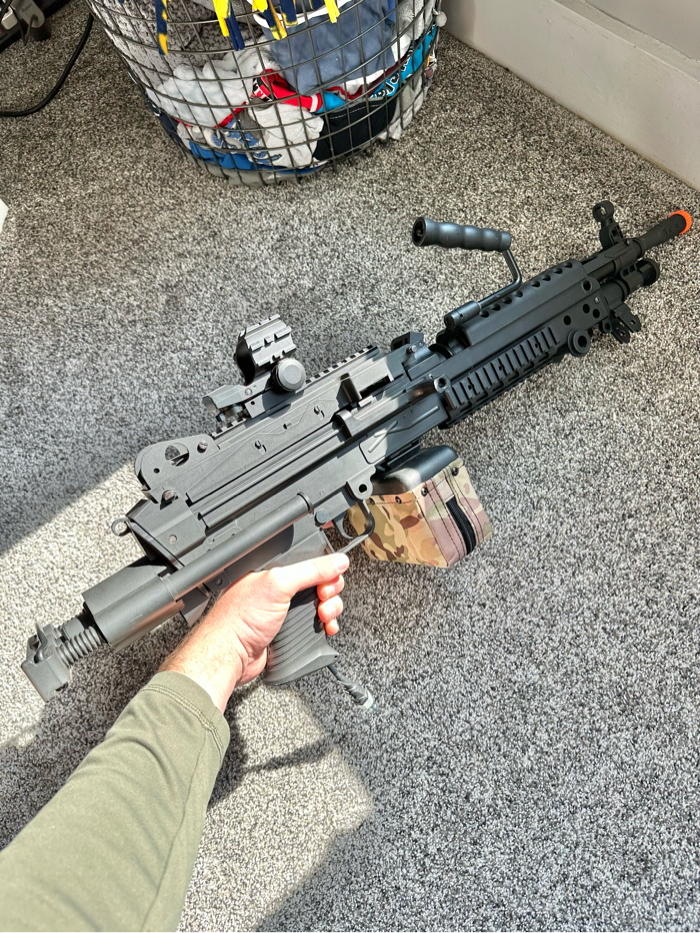 Selling my A&K Featherweight M249. It was the 350 FPS model. A polarstar jack was dropped into it. It also comes with the FCU. No battery tho. It comes with a box mag however the box mag has a battery that needs replaced or the lipo charger for it. Gun comes with a cheap Red dot too. Not sure if it works.