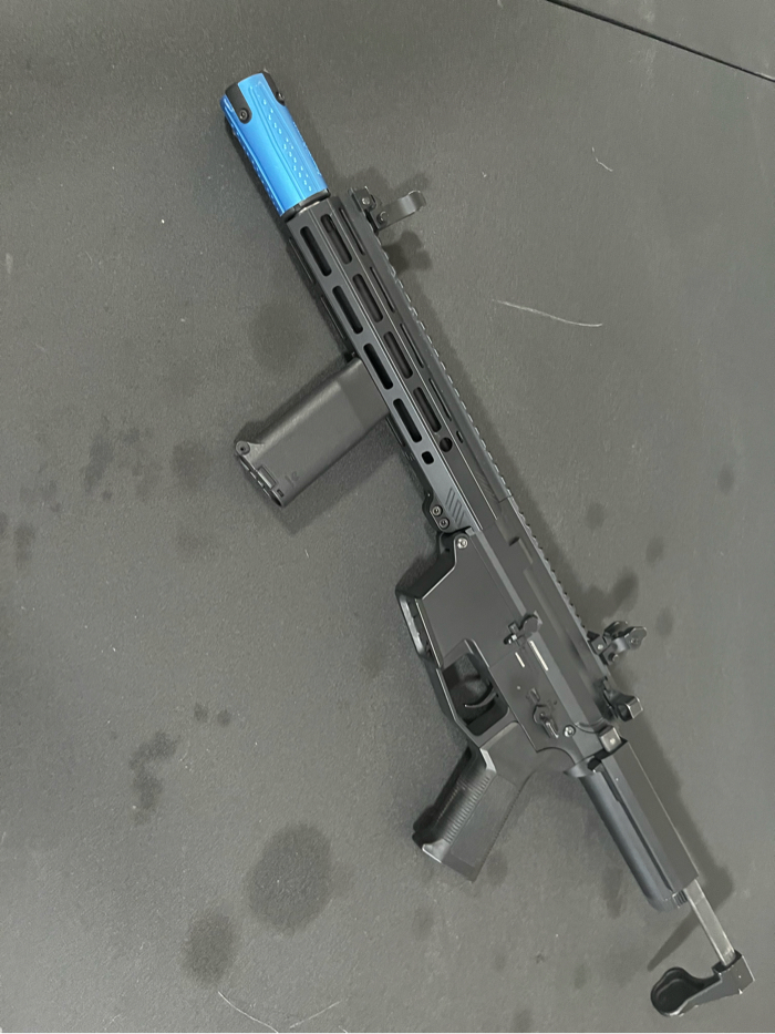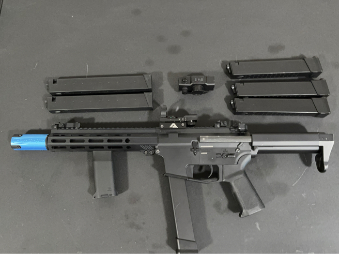 Included with Ocean Blue Falkor Defense Flash Hider and Lancer Tactical Slim Front Grip. Comes with 2 Hi Cap Magazines and 4 Mid Cap Magazines.