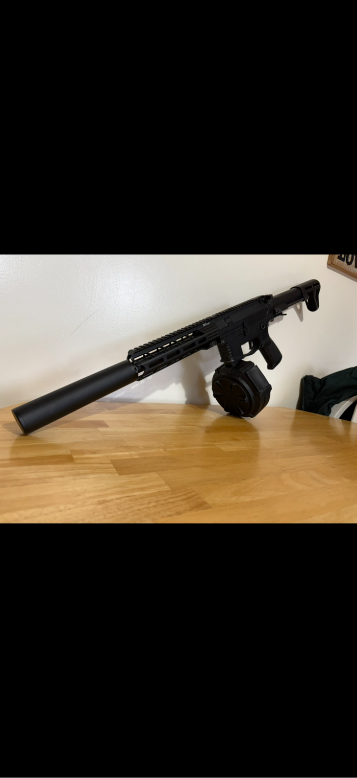 Billet style CNC aluminum receiver; the first all metal 9mm AR platform on the market MLOK front rail for grip, lights, and other tactical accessories